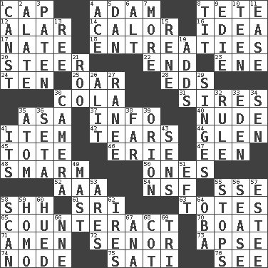 ACROSS 1. Head covering 4. First man 8. False hair 12. Having or resembling wings 14. Bodily heat indicating an inflammation 16. The main thing one is thinking about 17. Nathan's nickname 18. Pleas 20. Navigate 22. Conclude 23. Compass dir. 24. Nine, plus one 25. Rowing implement 28. Begley and Asner 30. Root beer relative 31. Titles for men of rank and authority 35. White ___ sheet 37. A message received and understood 40. Unadorned 41. A whole individual unit 42. Pulls apart 44. Small, secluded valley 45. Lug 46. One of the Great Lakes 47. Car or cant ending 48. Excessive but superficial compliments 50. Washington bills 52. American Automobile Association (abbr.) 54. Overdraft (abbr.) 55. Compass dir. 58. Quiet! 61. _ Lanka 63. Hauls 65. Neutralize 70. Water vessel 71. So be it 72. Sir (Sp.) 73. Domed church section 74. Thickened enlargement 75. Suttee (variant) 76. Observe DOWN 1. 2nd pers. sing. pres. of can (arch.) 2. Having winglike extensions 3. Eucharist need 4. Adept person 5. One of the 12 tribes of Israel 6. Keyboard modifier key 7. Greater amount 8. Teat (slang) 9. Singer Brickell 10. Adolescent 11. Relaxation 13. Portuguese money of account (variant) 15. French philosopher Descartes 19. Does sums 21. Friend of Pooh 26. Set down 27. The wife of a rajah (variant) 29. Scorches 30. Device for capturing images 32. General guideline 33. Locale of original sin 34. Elected rep. 35. Smallest unit of an element 36. Bristle 38. Distant 39. Constellation of myth 41. It is 43. Elected reps. 49. Vertical spar for supporting sails 51. Bank Draft (abbr.) 53. Ancient Greek god of war 55. Closes up, plugs up 56. Gospel singer Marvin 57. First name in cosmetics 58. Examine hastily 59. Like (prefix) 60. Became colored 62. Angers 64. Chief or king in Benin or Nigeria 66. Compass dir. 67. Santa ___, CA 68. Small bed 69. Three (prefix)