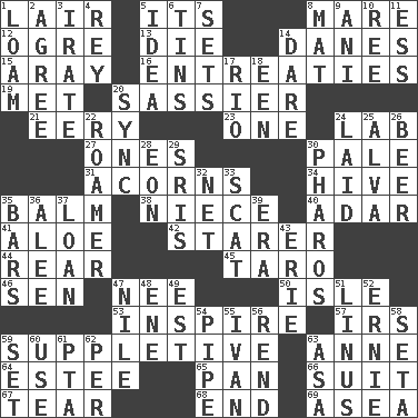 ACROSS 1. Den 5. It is 8. Female horse 12. Legendary monster 13. Expire 14. Natives or inhabitants of Denmark 15. Like ___ of sunshine 16. Pleas 19. Was introduced to 20. More lively and spirited 21. Suggestive of the supernatural 23. Single 24. Experiment locale 27. Singles 30. Diluted with white 31. Oak nuts 34. Hub of activity 35. Lip ointment 38. Sibling's daughter 40. The sixth month of the Jewish calendar 41. _ vera 42. A viewer who gazes fixedly 44. Hitchcock's "____ Window" 45. Edible starchy tuberous root 46. Elected rep. 47. Born 50. Capri or Wight 53. Motivate 57. Big collection agency 59. Supplementary 63. Singer Murray 64. First name in cosmetics 65. Baking dish 66. Set or collection 67. Lacerate 68. Conclude 69. Toward the sea DOWN 1. Rich soil 2. Match 3. Feeling or showing extreme anger 4. Marina Del _, California 5. The main thing one is thinking about 6. Airtight sealed metal containers 7. Puts into a specified state 8. Floor covering 9. Black tropical American cuckoo 10. To sift 11. Curvy letter 14. Have the gumption 17. _ de Janeiro 18. Car or cant ending 20. Synchronize (abbr.) 22. Nomad 24. Put down 25. Inventor's middle name 26. Fermented drink made from hops 28. A really long time 29. Indian titles of respect 30. N Egypt peninsula 32. Remaining after all deductions 33. Get outta here! 35. Drinking establishments 36. Toward shelter 37. Grant temporary use of 39. Epoch 43. One of the Great Lakes 47. "Death on the ____" 48. Compass dir. 49. Eastern Standard Time (abbr.) 51. "_ and Lucy" (Charlie Brown theme song) 52. Bert's buddy 54. Corncob 55. "Terrible" tsar 56. Tear apart 58. Bristle 59. Arrange properly for use 60. Purpose 61. Parent Teacher Assoc. 62. For each 63. White ___ sheet