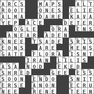 ACROSS 1. Curves 5. Atlas contents 9. The first octave above the treble staff 12. Carrot, for example 13. Washington bills 14. Writer Wiesel 15. _ mater 16. Have the gumption 17. Polynesian shrub of the pepper family 18. Slangy assent 19. Adept person 21. Prevent from occurring 22. Stare 24. Mouth or opening 26. Followers of ems 27. Approach 28. An important port of Yemen 29. Leg joint 30. Sadhe (variant) 32. Indian titles of respect 36. Immeasurably long periods of time 37. "We ___ not amused" (Victoria) 38. Not women's 39. Yard entry 40. Plants 42. Is not 43. SW Asia republic 44. Ms. Damita and namesakes 46. White ___ sheet 49. Lower and raise head in agreement 50. Supplemented with great effort 51. Tear up 53. Turn to the right 54. Double-curved letter 57. Within a short period 58. Inside; within (prefix) 61. In a ____ (agitated or irritated) 62. Celtic language 63. At once, immediately (arch.) 64. Shade of tan 65. Born 66. French philosopher Descartes 67. Adolescent DOWN 1. Like ___ of sunshine 2. Hero or heavy, e.g. 3. Part 4. R.R. building 5. Method 6. Santa ___, CA 7. For each 8. Compass dir. 9. Having winglike extensions 10. Make or become more lively 11. Pulls into pieces 14. Supplement with great effort 19. According to 20. Foregone conclusion 21. Daniel's nick name 23. Honkers 24. More peculiar 25. Portuguese money of account (variant) 27. Small Philippine buffalo 28. Composer Copland 29. Cask 31. First course 32. Grin 33. Dwelling 34. Lodging establishments 35. Fast jet (abbr.) 40. From 41. Toward shelter 43. Working for oneself (abbr.) 45. Mamie's husband 46. NE Netherlands city 47. Dinah or Pauly 48. Came up 52. Compass dir. 53. Went 55. The founder of a family 56. Make senseless or dizzy 58. Hearing organ 59. Compass dir. 60. Spanish title 61. Arrange properly for use