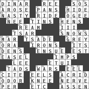 ACROSS 1. Middle Eastern gold or silver currency 6. Portuguese money of account (variant) 9. Mayday 12. Came up 13. Zero-star reviews 14. Flintstone garb 15. Thoroughly unpleasant 16. Travel on an animal 17. Double curve, resembling the letter S 18. Born 19. Metal containers 20. Coop moms 21. 480, 500 or 516 sheets of paper 23. One more than two 24. Russian ruler of old 25. Frozen precipitation (plural) 28. Impair 30. Sadhe (variant) 34. Jennifer or Joel 35. Mouth or opening 36. Removes the wrinkles 38. It is 39. Lairs 41. Take place subsequently 43. Eastern Standard Time (abbr.) 44. Artist's stand 46. Naughty children 48. Area sheltered from the wind 49. Needle holder 50. Bits 51. Armed conflicts 53. Snakelike fish 56. Quote 57. Snakelike fish 58. Sour-tasting 60. Aroma 61. Leg joint 62. Boldness 63. For each 64. And so on (abbr.) 65. NE Netherlands city DOWN 1. One of the 12 tribes of Israel 2. SW Asia republic 3. Olfactory organ 4. Michaelmas daisies 5. Marina Del _, California 6. Water falling in drops from the sky 7. Conclusions 8. Compass dir. 9. Seigniories (variant) 10. Lyric poems 11. Perceive with the eye 13. Demure 14. Weeding 19. Tarsus (plural) 20. Part of HMS, perhaps 22. Consume 24. Interpreter 26. Soaks 27. System (abbr.) 28. Method 29. Length times width 31. "We ___ not amused" (Victoria) 32. Spanish title 33. Followers of ems 37. Sets or collections 40. Sowing specialist 42. Australian flightless bird 45. French article 47. Components 49. Celtic language 50. Periodic rise and fall of the sea level 51. Left 52. Actor Baldwin 54. Blunders 55. Not recorded 56. Police officer (slang) 57. Make supply last 58. Santa ___, CA 59. Lair