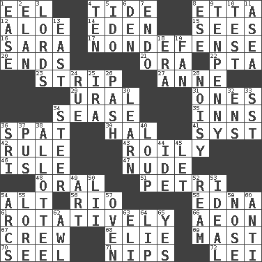 ACROSS 1. Snakelike fish 4. Event that recurs at intervals 8. Singer James 12. Medicinal plant 14. Paradise 15. Perceives with the eye 16. "Two Mules for Sister ____" 17. Unrelated to defense, as in spending 20. Extremities 21. Mouth or opening 22. Parent Teacher Assoc. 23. Empty completely 27. Singer Murray 29. Mountain range 31. Singles 34. Gospel singer Marvin 35. Restaurants 36. Argument over a trivial matter 39. Actor Linden 41. System (abbr.) 42. General guideline 43. Turbulent 46. Capri or Wight 47. Naked 48. Relating to the mouth 51. _ dish (used to culture cells) 54. The first octave above the treble staff 56. _ de Janeiro 58. Pulitzer Prize-winning author Ferber 61. Happening in regular succession 66. Period of immesurable duration 67. Group working together 68. Writer Wiesel 69. Vertical spar for supporting sails 70. Sew up the eyelids of hawks and falcons 71. Cuts off 72. Luau accessory DOWN 1. Relaxation 2. Style 3. Domineers 4. "___ Little Indians" 5. Wedding promise 6. Lair 7. Inside; within (prefix) 8. Compass dir. 9. 3-inch nail 10. Trial 11. Toward the sea 13. 90 degrees 18. Period 19. Avid follower 24. Regret 25. Lyricist Gershwin 26. Romantic infatuation 28. Annoyingly loud 30. Acquire or gain knowledge or skills 32. Followers of ems 33. Fast jet (abbr.) 34. Bull 36. Indian title of respect (Mr.) 37. Fluid product of inflammation 38. One to whom something is allotted 40. Central Nebraska county 44. Binary compound 45. Allow 49. Nonscientific branch of learning 50. Cards in a Roman deck? 52. 480, 500 or 516 sheets of paper 53. Standard of perfection 54. Curves 55. Old wives' tales, e.g. 57. Baking chamber 59. Characteristic smell of wine 60. Against 62. Leather borer 63. Connecticut Ivy Leaguer 64. Mouth edge 65. Affirmative reply
