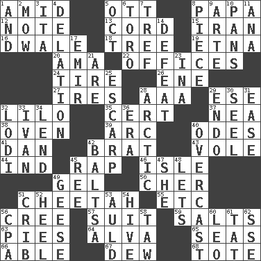 ACROSS 1. Among 5. Baseball player Mel 8. Dad 12. Musical sound 13. Drawstring 15. SW Asia republic 16. A sleeping potion; an opiate (poet.) 18. Woody plant 19. Inactive volcano in Sicily 20. Wet nurse (var.) 22. Places of business 24. Become fatigued 26. Compass dir. 27. Angers 28. American Automobile Association (abbr.) 29. Compass dir. 32. _ and Stitch 35. Sure thing 37. Teachers' org. 38. Baking chamber 39. Curve 40. Lyric poems 41. One of the 12 tribes of Israel 42. Naughty child 43. Grand slam 44. Indiana (abbr.) 45. Strike 46. Capri or Wight 49. Set 50. "Mermaids" star 51. Leopard's kin 55. And so on (abbr.) 56. Algonquian 57. Costume for a special activity 59. Table seasonings 63. Sliced desserts 64. Inventor's middle name 65. Oceans 66. Competent 67. Morning condensation 68. Carryall DOWN 1. Also 2. Cut the grass 3. Call ___ day 4. Accusation by an informer 5. Sep. follower 6. "Corrida" creature 7. Unclean, religiously 8. Component 9. Johnson of "Laugh-In" 10. Baking dishes 11. Santa ___, CA 14. Outscore 17. Independent ruler or chieftain 21. "We ___ not amused" (Victoria) 23. _ tizzy (2 wds.) 25. Fortification 28. Northern region 29. Inside; within (prefix) 30. Stitch closed the eyes of (a falcon) 31. Relaxation 32. Farming town in central California 33. "Terrible" tsar 34. Grant temporary use of 36. Period 40. Cloudy 42. Greek mezzo-soprano Agnes 45. Portuguese money of account (variant) 47. A female animal or person 48. Allows 49. Honkers 51. Baby bed with high sides 52. Person who is morally reprehensible 53. Old (Scot.) 54. Hub of activity 56. Accounting whiz (abbr.) 58. The 23rd letter of the Hebrew alphabet 60. Lion 61. Make lace 62. Compass dir.