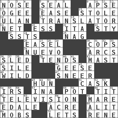 ACROSS 1. Sense of smell 5. Lick closed 9. Domed church section 13. Double curve, resembling the letter S 14. Relaxation 15. Fur scarf 16. Uhlan (variant) 17. Interpreter 19. Remaining after all deductions 20. Double-curved letter 21. Call ___ day 22. Filthy place 23. Fast planes 25. Tired old horse 26. Artist's stand 30. 911 reaches them 34. New (sp.) 35. Arches 36. Downhill vehicle 39. Is inclined (to) 42. Vertical spar for supporting sails 43. Filth; sediment 44. Honkers 46. Uncontrolled 47. Scornful expression 48. Attila the _ 51. Keg 54. Big collection agency 57. _ tizzy (2 wds.) 58. Cooking vessel 60. Teat (slang) 62. Household entertainment appliance 65. Female horse 66. Peak District village in England 67. 43,560 square feet 68. Set down 69. Crowds into 70. Allows 71. French philosopher Descartes DOWN 1. Part of speech 2. Stares 3. Theater features 4. Car or cant ending 5. Arranges properly for use 6. Hearing organs 7. White ___ sheet 8. Soviet premier 1918-24 9. _ moment's notice (2 wds.) 10. Plant holders 11. Notch 12. Suggestive of the supernatural 15. Volcanic refuse 18. R.R. building 20. Son of Isaac 24. Watched over 27. Put into a specified state 28. First lady 29. Yearns 30. Device for capturing images 31. Mouth or opening 32. Personal Computers (abbr.) 33. Fast jet (abbr.) 36. Compass dir. 37. Cards in a Roman deck? 38. Pipe bend 40. Lair 41. Perceive with the eye 45. Religious group 48. Hub of activity 49. Single; one (prefix) 50. Rhinal 52. Showing deterioration from age 53. Japanese brewing company 54. Detail 55. Do over again 56. Broad, flat, thick piece 58. Left side of a ship or aircraft 59. Singles 61. Wig 63. Raised railways 64. Frozen water 65. Spoil