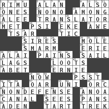 ACROSS 1. Tall New Zealand timber tree 5. Actor Alda or Thicke 9. In addition 13. Singles 14. Words to Nanette 15. Amid 16. Toward shelter 17. Interpreter 19. Was introduced to 20. 23rd letter of the Greek alphabet 21. Supplement with great effort 22. Deep reverence 23. Russian ruler of old 25. Nervous spasm 26. Fathers 30. Undercover agent 34. Excessive but superficial compliments 35. One of the Great Lakes 36. Jai ____ 39. Aches 42. Travel by water 43. Fails to keep up a pace 44. Plunders 46. Collude with 47. Bert's buddy 48. At this time 51. Inconspicuous attention getter 54. Call ___ day 57. Boat paddle 58. Single; one (prefix) 60. The grampus (Milton) 62. Unrelated to defense, as in spending 65. Small Philippine buffalo 66. Lessep's creation 67. Observes 68. Zero-star reviews 69. Arabian gulf 70. Small pie 71. Long journey DOWN 1. Wander aimlessly 2. An arm off of a larger body of water 3. Confronts 4. Purpose 5. Pismires 6. Australian parrot (variant) 7. Santa ___, CA 8. Music written for nine 9. Nanny (var.) 10. Globular water bottle used in Asia 11. Frozen precipitation 12. Legendary monster 15. Actor Baldwin 18. What Jean-Claude Killy likes to do 20. Demure 24. Aid 27. Reproach for some lapse or misdeed 28. Period 29. Grin 30. Makes clutter 31. Mouth or opening 32. Cards in a Roman deck? 33. Snakelike fish 36. In the manner of 37. Experiment locale 38. Grow older 40. Not either 41. Boy, to dad 45. Native american tent (variation) 48. Christmas carol 49. Clumsy lout 50. Take or capture by force 52. Echolocation 53. Heavy duty weighing machine 54. South American Indian 55. Frog relative 56. Singer Murray 58. One who makes use of a thing 59. A home for chicks 61. Keg 63. One of the 12 tribes of Israel 64. Teachers' org. 65. Fitting