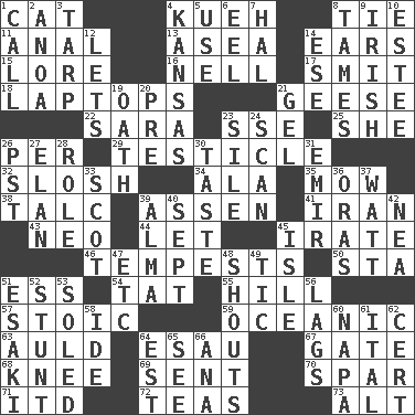 ACROSS 1. Domesticated feline 4. Malaysian steamed pastry 8. Make a knot 11. Of or related to the anus 13. Toward the sea 14. Hearing organs 15. Old wives' tales, e.g. 16. 1994 drama film starring Jodie Foster 17. Stricken, poetically 18. Portable computers 21. Honkers 22. "Two Mules for Sister ____" 23. Compass dir. 25. A female animal or person 26. For each 29. One of the two male reproductive glands 32. Splash clumsily 34. Insect wing 35. Cut the grass 38. Baby powder 39. NE Netherlands city 41. SW Asia republic 43. Modern: prefix 44. Allow 45. Feeling or showing extreme anger 46. Storms 50. R.R. building 51. Double-curved letter 54. Make lace 55. Land elevation 57. Unemotional 59. Pertaining to the sea 63. Old (Scot.) 64. He sold his birthright 67. Yard entry 68. Leg joint 69. Posted 70. Coast Guard woman 71. It would 72. Afternoon social gatherings 73. The first octave above the treble staff DOWN 1. Give a ring to 2. Small Philippine buffalo 3. Canvas cover 4. Sunflower state 5. Purpose 6. Snakelike fish 7. Actor Linden 8. Makes less strong or intense 9. From or relating to Ireland 10. First name in cosmetics 12. Allows 14. Compass dir. 19. Pledge 20. Before (prefix) 21. Set 23. Filth; sediment 24. Examine hastily 26. Pacific Standard Time (abbr.) 27. Flair 28. Hero or heavy, e.g. 30. Clothes sense 31. Independent ruler or chieftain 33. Native of Scotland 36. Mouths or openings 37. Electrical Unit 39. _ mater 40. Back-to-school mo. 42. Teachers' org. 45. Capri or Wight 47. And so on (abbr.) 48. Yells 49. Nervous spasm 51. 1973 Nobel Price Winner (Physics) Leo 52. Check the growth or development of 53. Having a sole or soles 56. Falls behind 58. Binary compound 60. California wine valley 61. Slanted text style (abbr.) 62. Certainty 64. Eastern Standard Time (abbr.) 65. Observe 66. Santa ___, CA