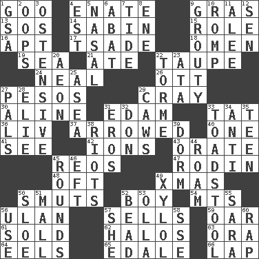 ACROSS 1. Thick or sticky substance 4. Maternal 9. Pate de foie ____ 13. Distress signal 14. Unit of acoustic absorption 15. Hero or heavy, e.g. 16. Fitting 17. Sadhe (variant) 18. Sign of something about to happen 19. Ocean 21. Had dinner 22. Grayish beige 24. Anneal 26. Baseball player Mel 27. Mexican monetary units 29. Supercomputer manufacturer 30. Place in a line 31. Dutch treat 33. Make lace 36. 54 in ancient Rome 37. Moved like an arrow 40. Single 41. Perceive with the eye 42. Charged atoms 43. Declaim 45. Vintage cars 47. "The Thinker" sculptor 48. Often (poetically) 49. Dec. holiday 50. Particles of soot 52. Male child 54. Mountains (abbr.) 56. ____ Bator 57. Makes a sale 59. Boat paddle 61. Disposed of to a purchaser 62. Auras 63. Mouth or opening 64. Snakelike fish 65. Peak District village in England 66. Infant locale DOWN 1. Girls' org. (abbr.) 2. I made a mistake 3. Clearly or manifestly demonstrative 4. Eastern Standard Time (abbr.) 5. Relating to the nose 6. Blind as ____ 7. Periodic rise and fall of the sea level 8. Compass dir. 9. Cross 10. Frolic 11. Toward shelter 12. Elected rep. 20. A really long time 22. Singer Mel 23. _ moment's notice (2 wds.) 25. Toward the sea 27. Friends 28. Writer Wiesel 29. Crow sounds 31. Greek god of love 32. Spanish title 33. Inedible or poisonous agaric 34. Opposed to 35. Adolescent 38. Disturbances 39. Dormintory (informal) 44. Wander 45. Periods in a boxing match 46. Newt 49. Xylene (variant) 50. A type of plum 51. Promenade 52. Necklace unit 53. Water jar 55. "Two Mules for Sister ____" 56. Purpose 57. A female animal or person 58. Compass dir. 60. Hit sharply and swiftly