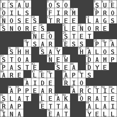 ACROSS 1. He sold his birthright 5. Bear (Spanish) 8. Take to court 11. Petroleums 12. Not soft or yielding to pressure 14. Adept person 15. Olfactory organs 17. Relationship diagram 18. Fails to keep up a pace 19. Sounds asleep 21. Poe poem 23. Modern: prefix 25. Proofreading order 26. Russian ruler of old 27. Double-curved letter 28. Parent Teacher Assoc. 31. Quiet! 33. Declare 35. Saint headwear 37. Portico 38. ___ Haven, CT 40. Moist 41. Thick mixture 43. Ocean 45. Color 46. "We ___ not amused" (Victoria) 47. Allow 50. Flats, for short 52. Helper 53. _ de Janeiro 54. Become visible 56. Northern region 61. Narrow board 62. Path through which fluid escapes 65. Declaim 66. Strike 67. Singer James 68. Mountain range southwest of Kyrgyzstan 69. _ tizzy (2 wds.) 70. Erode 71. Shout DOWN 1. Immeasurably long periods of time 2. The Jewish people; Israel 3. In addition 4. One who makes use of a thing 5. Often (poetically) 6. Title for a knight 7. Threatening words 8. Coast Guard woman 9. Goad 10. Greek goddess of the dawn 13. Confronts 16. Elected reps. 18. Car dealer's back yard 20. Oceans 22. Tender 24. NW Algerian seaport 26. Not this but _ 28. Frolic 29. Heavy book 30. Viper 31. Play the lead 32. Flexible conduit 34. It is so 36. Does sums 37. Health resort 39. Put on (as clothing) 42. Writer Wiesel 44. Capital of Western Samoa 48. Peak District village in England 49. Cigar-shaped 51. "Corrida" creature 52. Fitting 54. ____ Jay Lerner 55. Dad 57. Supercomputer manufacturer 58. Falsehood 59. Slanted text style (abbr.) 60. To provide with a ceiling 61. Indian title of respect (Mr.) 63. "One Day ___ Time" 64. Krazy ___ of comics