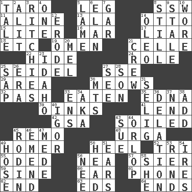 ACROSS 1. Pacific island yam 5. Part of a journey 8. Compass dir. 11. Place in a line 13. Wing 14. Von Bismarck 15. 61 cubic inches 16. Make imperfect 17. One who doesn't tell the truth 18. And so on (abbr.) 19. Sign of something about to happen 21. Cell (Danish) 22. Flintstone garb 24. Hero or heavy, e.g. 25. A glass for beer 27. Compass dir. 29. Length times width 30. Catcalls? 32. Romantic infatuation 33. Eroded 35. Pulitzer Prize-winning author Ferber 39. Pig sounds 41. Grant temporary use of 42. Girls' org. (abbr.) 43. Dirtied 45. San ____ (Riviera town) 48. Capital and largest city of Mongolia 49. Homing pigeon 50. The bottom of a shoe or boot 52. Three (prefix) 55. Wrote a lyric poem 56. Teachers' org. 57. Flexible twig of a willow tree 59. Trig term 60. Hearing organ 61. Give a jingle 62. Conclusion 63. Begley and Asner 64. Conclusions DOWN 1. Story 2. Came down and settled, as after flight 3. Actors Guy, Robert Welles, and Clint 4. Single 5. Unable to walk 6. Liveliness 7. Slender fish 8. Free from disturbance or agitation 9. Having lost freshness 10. Had on 12. Wear away 14. Butter sub 20. Cartoonist voice _ Blanc 21. Group working together 23. Potato state 25. Plant excrement 26. Period 27. Perceive with the eye 28. Male child 30. Mountains (abbr.) 31. Major League Baseball Commissioner Bud 33. Followers of ems 34. Alias (abbr.) 36. Conveyance 37. Compass dir. 38. Increase 40. Russian composer Stravinsky 43. Institute legal proceedings 44. Lowest deck of a ship 45. "The Thinker" sculptor 46. Make improvements or corrections to 47. Ancient Persian 49. Stockings 50. Froth on beer 51. Hearing organs 53. Tear apart 54. Angers 56. Born 58. A female animal or person