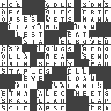 ACROSS 1. Enemy 4. Gilded 8. Sty mamas 12. Mouth or opening 13. Margarine 14. 4th largest of the Great Lakes 15. Fertile tracts in a desert 18. Soaks 19. Grandmother 20. Imposing or collecting, as a tax 22. Daniel's nick name 23. For fear that 24. Consume 25. R.R. building 26. Turned at an angle; bent 30. Girls' org. (abbr.) 33. Yearns 36. Redecorate 37. Water jar 39. Teachers' org. 40. Post 41. Inside of hand 42. Full of seeds 44. Groovy apt. 45. Paper fasteners 47. Pipe bend 50. Sight organ 51. Grant temporary use of 53. "We ___ not amused" (Victoria) 54. Deli grouping 57. Inactive volcano in Sicily 59. Actor Baldwin 61. Confronts 63. Heroin 64. One who doesn't tell the truth 65. Head covering 66. Flatfish 67. Domed church section 68. Epoch DOWN 1. Egg _ yung 2. Taken by mouth 3. Artist's stand 4. Woman's formal wear 5. Cassini of fashion 6. Allow 7. Two (Sp.) 8. Elected representatives 9. Northwest Algerian city 10. Acquire through effort 11. Ocean 16. Nights before holidays 17. System (abbr.) 21. Slanted text style (abbr.) 22. Pat or tap gently 24. Raised railways 26. Mild oath 27. Shed a tear 28. Pulitzer Prize-winning author Ferber 29. Texas town _ City 30. Republicans 31. Narrow board 32. Silent film actress Nazimova 34. Washington bills 35. Born 38. Electrical Measurement 42. Perceive with the eye 43. Shout 46. Sodium hydroxide 48. Rich soil 49. Unable to walk 52. Sibling's daughter 53. Of or related to the anus 54. Oceans 55. 1/640 square mile 56. Play the lead 57. Double-curved letter 58. Ring climax 59. In the manner of 60. Mouth edge 62. Health resort
