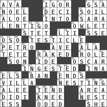 ACROSS 1. Actress Gardner 4. Composer Stravinsky 8. Girls' org. (abbr.) 11. Christmas carol 13. Tenth: prefix 14. Earth 15. _ vera 16. To the inside or interior of 17. "Two Mules for Sister ____" 18. Small, flat, pigmented spot on the skin 21. A small or young owl 22. Proofreading order 23. Cards in a Roman deck? 25. Compass dir. 26. Bear (Spanish) 29. A testis 32. Stone: prefix 34. "___ Maria" 35. Wing 38. Wig 39. Moved through 41. Hero or heavy, e.g. 43. Boy, to dad 44. Binary compound 45. Motion picture award 46. Eaten 50. _ tizzy (2 wds.) 51. Raised railways 54. Bar 55. Extremities 57. Country residence 59. Nestling 63. Toward shelter 64. Watch over 67. Type of rug 68. "You Light Up My Life" star Conn 69. Leg joint 70. Egg locale 71. Double-curved letter 72. Wrote a lyric poem 73. A female animal or person DOWN 1. Of or related to the anus 2. Grand slam 3. A really long time 4. Foolish or stupid persons 5. Commissioned military rank (abbr.) 6. Sep. follower 7. _ de Janeiro 8. Purposes of endeavors 9. Begets 10. Having winglike extensions 12. Allows 14. Compass dir. 19. "Tell ____ the Marines!" 20. Turn to the right 21. Lubricate 23. Not recorded 24. On the rocks 26. Elect 27. Perceives with the eye 28. Von Bismarck 30. Receives possession of 31. Hearing organs 33. Painter Guido (1575-1642) 36. Locales 37. ____ Jay Lerner 39. Port city in Latvia 40. An important port of Yemen 42. Epoch 45. Likelihood 47. Basketball assoc. 48. Looked after 49. Compass dir. 51. Dodge 52. Ms. Damita and namesakes 53. Bobsleighs 56. Comedian Laurel of Laurel & Hardy 58. Flowery wreath 60. Angers 61. Delicate 62. Yard entry 64. Ring climax 65. Conclusion 66. Born