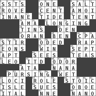 ACROSS 1. Fast planes 5. Single 8. Table seasoning 12. Be footloose 13. Penny 15. Mine, in Marseilles 16. Empty; void 18. Periodic rise and fall of the sea level 19. Portable shelter 20. Nanny (var.) 22. Yearning 24. Metal containers 26. Lair 27. Northwest Algerian city 28. Benjamin's nick name 29. Tax preparer (abbr.) 32. Move through with a circular motion 35. Wrote a lyric poem 37. Reproach for some lapse or misdeed 38. Immeasurably long periods of time 39. Victory 40. Back-to-school mo. 41. Fitting 42. Observes 43. Afternoon social gatherings 44. Lion 45. It would 46. Aroma 49. "One Day ___ Time" 50. Grandmother 51. Puckering 55. Soggy 56. Event scenes 57. Hero or heavy, e.g. 59. Unemotional 63. Capri or Wight 64. Takes to court 65. Mitch Miller's instrument 66. Slanted text style (abbr.) 67. Compass dir. 68. Billionth: prefix DOWN 1. _ Lanka 2. Male child 3. Federal power corp. 4. Elected representatives 5. Sep. follower 6. Famous astronaut Armstrong 7. Inside; within (prefix) 8. Smooth fabric 9. So be it 10. Having great length 11. Teat (slang) 14. Watched over 17. Arab leader 21. Santa ___, CA 23. Commissioned military rank (abbr.) 25. Frozen precipiation fell 28. Gillaume's butler role 29. Algonquian 30. Dad 31. Flats, for short 32. Lick closed 33. Drink excessively 34. To the inside or interior of 36. Expire 40. Ski resort town in Vermont 42. Flight of steps 45. It is 47. Simpleton 48. Singles 49. Satellite of Uranus 51. Mail 52. Southern CA. univ. 53. Part of speech 54. Small, secluded valley 56. Cards in a Roman deck? 58. Compass dir. 60. Chief or king in Benin or Nigeria 61. Electrically charged atom 62. Corporate head (abbr.)