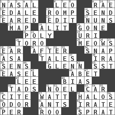 ACROSS 1. Rhinal 6. Lion 9. Actress Charlotte 12. Peak District village in England 13. Frolic 14. Post 15. Having ears or earlike features 16. Prepare for publication 17. Religious women 18. Atlas unit 19. Set down 20. Went 21. Many (prefix) 23. RI univ. 24. "Corrida" creature 25. Catcalls? 28. Ewer handle 30. Following 34. Fastener 35. White ___ sheet 36. Stories 38. Lyricist Gershwin 39. Elected reps. 41. American astronaut and politician John 43. Fast jet (abbr.) 44. Artist's stand 46. Collude with 48. Area sheltered from the wind 49. Prejudice 50. Small amounts or degrees 51. Christmas carol 53. Automobile 56. Quote 57. Electrical Unit 58. Radiant circles of light 60. Aroma 61. Pismires 62. Feeling or showing extreme anger 63. For each 64. Friend of Pooh 65. Small fatty European fish DOWN 1. Born 2. First man 3. "Two Mules for Sister ____" 4. City in Syria 5. Directed 6. Farming town in central California 7. Give off 8. Choose 9. One who advocates reunion 10. Queen of England 1702-14 11. Begley and Asner 13. Have trust in 14. Sounds asleep 19. Upward 20. Chewing product 22. Mouth or opening 24. Interpreter 26. Armed conflicts 27. Petty quarrel 28. Relaxation 29. Toward the sea 31. Label 32. Pipe bend 33. To separate or throw off 37. Slow-paced one 40. Sowing specialist 42. Basketball assoc. 45. French article 47. Fortification 49. Antes 50. Periodic rise and fall of the sea level 51. Billionth: prefix 52. "Beetle Bailey" pooch 54. Having or resembling wings 55. Roll call or roster of names 56. Police officer (slang) 57. Armed conflict 58. Part of HMS, perhaps 59. Arrange properly for use