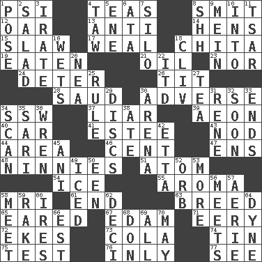 ACROSS 1. Air pressure measure (abbr.) 4. Beverages made from leaves 8. Stricken, poetically 12. Boat paddle 13. Against 14. Coop moms 15. Cole _ (cabbage dish) 17. Welt 18. Riviera of "Kiss of the Spider Woman" 19. Ingested 21. Lubricate 23. Not either 24. Prevent from occurring 26. Teat (slang) 28. Saudi Arabian king (1953-1964) 30. Contrary to your interests or welfare 34. Compass dir. 37. One who doesn't tell the truth 39. A really long time 40. Automobile 41. First name in cosmetics 43. Dreamland 44. Length times width 46. Penny 47. Followers of ems 48. Fools 51. Tiny particle 54. Frozen water 55. Odor 58. Medical imaging device (abbr.) 61. Conclude 63. A special lineage 65. Having ears or earlike features 67. Dutch treat 71. Suggestive of the supernatural 72. Supplements with great effort 73. Root beer relative 74. Shallow baking pan 75. Trial 76. Inwardly 77. Perceive with the eye DOWN 1. Airs 2. Vegetable dish 3. Feeling or showing extreme anger 4. The 23rd letter of the Hebrew alphabet 5. Compass dir. 6. "One Day ___ Time" 7. Grain storage tower 8. Quiet! 9. Count _ (2 wds.) 10. To the inside or interior of 11. Russian ruler of old 16. Moistens 18. 154 in Roman numerals 20. Teachers' org. 22. It would 25. Court order 27. Beverage made from leaves 29. Plates 30. Sports stadium 31. French philosopher Descartes 32. Within a short period 33. Extremities 34. Skim 35. Indian skirt 36. Songbird 38. Had dinner 42. Singer James 45. Cuckoo 49. On the rocks 50. Car or cant ending 52. Globe 53. Greater amount 56. Confronts 57. Nest on high 58. Rendezvous 59. Immoral or dissolute person 60. Angers 62. Tenth: prefix 64. Centimeter-gram-second unit of force 66. Eastern Standard Time (abbr.) 68. Spanish title 69. Everything 70. Can I?