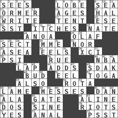 ACROSS 1. Observes 5. Ear part 9. Ocean 12. Abalone 14. Matures 15. Actor Linden 16. Compose 17. Portable shelter 18. Compass dir. 19. Fast jet (abbr.) 20. Strong, restless desires 23. Nathan's nickname 24. Small Philippine buffalo 25. Norwegian king 27. Religious group 30. Madame (abbr.) 32. Not either 33. At sea 34. Snakelike fish 36. One more than ninety 38. Air pressure measure (abbr.) 39. Regret 40. Basketball assoc. 43. Infant locale 46. Sums up 48. Neighbor of Neb. 49. Partially opened flower 51. Snakelike fish 52. Ancient Roman robe 53. In addition 54. Roll call or roster of names 56. Unable to walk 58. Makes clutter 61. Daniel's nick name 64. In the manner of 65. Yard entry 66. Place in a line 68. Two (Sp.) 69. Trig term 70. Disturbances 71. Affirmative reply 72. Of or related to the anus 73. Inconspicuous attention getter DOWN 1. Sty mamas 2. Blunders 3. Send forth 4. Arrange properly for use 5. Thin strip of wood or metal 6. Double curve, resembling the letter S 7. Gillaume's butler role 8. Eastern Standard Time (abbr.) 9. Bundle of cut stalks of grain 10. 90 degrees 11. Toward shelter 13. It's straight from the horse's mouth 21. Heavy book 22. Device for capturing images 23. Drug cop 24. "One Day ___ Time" 26. Brine-cured salmon 27. Plant excrement 28. Double-curved letter 29. To provide with a ceiling 31. Evade 35. Spring feasts 37. _ china 41. Paper or plastic container 42. Alias (abbr.) 44. Competent 45. Fluid product of inflammation 47. A type of plum 48. R.R. building 50. Kingdom 53. Collect or gather 55. Russian ruler of old 56. Kenny Rogers chart-topper in '80 57. _ vera 59. Inactive volcano in Sicily 60. Stitch closed the eyes of (a falcon) 61. "Vaya con ____" 62. Pismires 63. A home for chicks 65. Girls' org. (abbr.) 67. Mouth edge