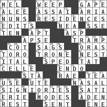 ACROSS 1. Cartoonist voice _ Blanc 4. Shed a tear 8. Open wide 12. Toward shelter 14. Slender Brazilian palm 16. Operatic vocal solo 17. Religious women 18. Homes 20. Prepares for publication 22. Teachers' org. 23. Compass dir. 24. "___ Little Indians" 25. Fitting 28. Viper 30. Domed church section 31. _____ steamer (cargo ship) 35. Small bed 37. Droops 40. Mouths or openings 41. "Corrida" creature 42. Marketplace scale 44. Egg locale 45. Slanted text style (abbr.) 46. Drove too fast 47. Make lace 48. Cell (Danish) 50. Inside; within (prefix) 52. R.R. building 54. Actress Charlotte 55. Afternoon social gathering 58. Purpose 61. Shoshoni 63. Relating to the nose 65. Seigniories (variant) 70. Suttee (variant) 71. One of the Great Lakes 72. Methods 73. Arabian gulf 74. State of inaction 75. Transmitted 76. Compass dir. DOWN 1. French painter Edouard 2. Evade 3. Soviet premier 1918-24 4. Armed conflict 5. Compass dir. 6. Curvy letter 7. Ache 8. Separate the seeds from cotton 9. Curves 10. Sliced desserts 11. Comfort 13. Eastern Standard Time (abbr.) 15. The main thing one is thinking about 19. Compass direction 21. Plant excrement 26. Inconspicuous attention getter 27. Pulls apart 29. Right away 30. Ringlike coral islands and reefs 32. Type of rug 33. Vertical spar for supporting sails 34. Pacific Standard Time (abbr.) 35. ____ d'Azur (French Riviera) 36. Spoken 38. Grand Old Party 39. Scornful expression 41. Nervous spasm 43. Pulitzer Prize-winning author Ferber 49. Needle holder 51. Lair 53. Tiny particle 55. Sadhe (variant) 56. Ingested 57. Place in a line 58. One who uses or employs something 59. Beget 60. Armor plate that protects the chest 62. Greek god of love 64. White ___ sheet 66. Remaining after all deductions 67. Binary compound 68. Car or cant ending 69. Fast jet (abbr.)
