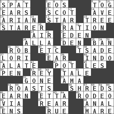 ACROSS 1. Argument over a trivial matter 5. Greek goddess of the dawn 8. Coat; cloak 11. Hearing organs 12. Highlander 14. "___ Maria" 15. Believer in; advocate of (suffix) 17. Play the lead 18. Woody plant 19. A viewer who gazes fixedly 21. Food allowance for one day 23. Wind 25. Paradise 26. Silent film actress Nazimova 27. Lair 28. Bar 31. Director Reiner 33. And so on (abbr.) 35. Sadhe (variant) 37. Australian parrot (variant) 38. Ewer handle 40. Southeast Asian peninsula 41. Having winglike extensions 43. Plant holder 45. French article 46. Fenced enclosure 47. Marina Del _, California 50. Lie 52. Went 53. Wet nurse (var.) 54. Cooks with dry heat, as in an oven 56. Tears up 61. Merit 62. Singer James 65. Cowboy competition 66. By way of 67. Stern 68. Of or related to the anus 69. Followers of ems 70. Regret 71. Female horse DOWN 1. Oceans 2. Role in a play 3. Roberta Peters solo 4. Russian ruler of old 5. Double-curved letter 6. Sep. follower 7. Flew 8. Edible starchy tuberous root 9. Baking chamber 10. Turn to the right 13. Buy and sell 16. Be tempered by heat 18. Shallow baking pan 20. Cause heat under the collar 22. Portable shelter 24. Assign a rank or rating to 26. "This won't hurt ____!" 28. Object of repulsion 29. Sums up 30. Modern: prefix 31. Hero or heavy, e.g. 32. NW Algerian seaport 34. Head covering 36. Drop; flow; fall 37. Infant locale 39. Round or rotation of duties 42. Greek god of love 44. Scottish caps 48. Keyboard key 49. Of or pertaining to yesterday 51. Cowardly lion portrayer 52. Separate the seeds from cotton 54. Water falling in drops from the sky 55. Mouths or openings 57. Wander aimlessly 58. Pulitzer Prize-winning author Ferber 59. Letter starter 60. Not divided or shared with others 61. Night before a holiday 63. The 19th letter of the Greek alphabet 64. "We ___ not amused" (Victoria)