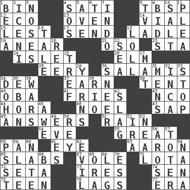 ACROSS 1. Storage container 4. Suttee (variant) 8. Cook's measure (abbr.) 12. Environmental prefix 13. Baking chamber 14. Small bottle 15. For fear that 17. Transmit 18. Dipping utensil 19. Approach 21. Bear (Spanish) 23. R.R. building 24. Small island 26. Shade tree 28. Suggestive of the supernatural 30. Deli grouping 34. Morning condensation 37. Merit 39. Portable shelter 40. Chief or king in Benin or Nigeria 41. Strips of potato fried in deep fat 43. Non-commissioned officer (abbr.) 44. Israeli folk dance 46. Christmas carol 47. Plant excrement 48. Replies (to) 51. Precipitation 54. Night before a holiday 55. Relatively large 58. Baking dish 61. Sight organ 63. Composer Copland 65. Broad, flat, thick pieces 67. Grand slam 71. Globular water bottle used in Asia 72. Bristle 73. Angers 74. Elected rep. 75. Adolescent 76. Straggles 77. Epoch DOWN 1. Actor Lugosi 2. Ancient Celtic tribe of eastern Britain 3. Olfactory organs 4. Mayday 5. "___ Maria" 6. "___ Little Indians" 7. Southeast Asian peninsula 8. Federal power corp. 9. Auction offers 10. Table seasoning 11. Entreaty 16. Story 18. Hang loosely or laxly 20. Portuguese money of account (variant) 22. Ocean 25. Unclean, religiously 27. Floor covering 29. Tall tales 30. Scornful expression 31. Not women's 32. South American Indian 33. Close up, plug up 34. Capital of the state of Qatar 35. Inky black, to poets 36. Armed conflicts 38. _ de Janeiro 42. Volcanic refuse 45. Deep reverence 49. Nights before holidays 50. Marina Del _, California 52. Lyricist Gershwin 53. Actress Patricia 56. Came up 57. Carrier 58. Inconspicuous attention getter 59. Toward shelter 60. Nathan's nickname 62. Morally bad or wrong 64. Nanny 66. Prohibit 68. Mouth or opening 69. Part of a journey 70. Curvy letter