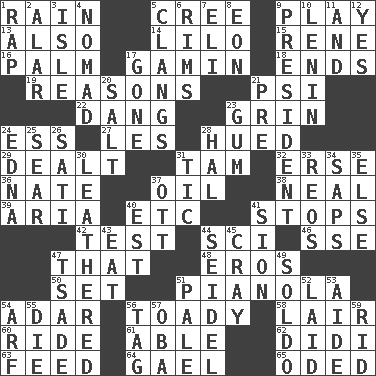 ACROSS 1. Water falling in drops from the sky 5. Algonquian 9. Frolic 13. In addition 14. _ and Stitch 15. French philosopher Descartes 16. Inside of hand 17. Homeless child 18. Extremities 19. Thinks logically 21. Air pressure measure (abbr.) 22. Mild oath, euphamism for damn 23. Amused look 24. Curvy letter 27. French article 28. Took on color 29. Started a card game 31. Scottish cap 32. Celtic language 36. Nathan's nickname 37. Petroleum 38. Anneal 39. Roberta Peters solo 40. And so on (abbr.) 41. Obstructs or blocks passage 42. Trial 44. _-fi 46. Compass dir. 47. Not this but _ 48. Greek god of love 50. Put into a specified state 51. Player piano 54. The sixth month of the Jewish calendar 56. Sycophant 58. Den 60. Travel on or in a vehicle 61. Competent 62. "You Light Up My Life" star Conn 63. Nourish 64. Highlander 65. Wrote a lyric poem DOWN 1. Reproach for some lapse or misdeed 2. Having or resembling wings 3. Small island 4. Wanderer 5. Gives out a loud, resonant sound 6. Basketball hoops 7. Connecticut Ivy Leaguer 8. A really long time 9. Elected leader of a country 10. Soviet premier 1918-24 11. Also 12. Consenting reply 17. Went 20. Table seasoning 21. Before (prefix) 23. Chewing product 24. Pulitzer Prize-winning author Ferber 25. Dry up 26. Suttee (variant) 28. Actor Linden 30. Resembling or made to resemble leather 31. Nervous spasm 33. Vintage cars 34. Plant excrements 35. Otherwise 37. Baseball player Mel 40. Eastern Standard Time (abbr.) 41. The Jewish people; Israel 43. Consume 44. A glass for beer 45. Supercomputer manufacturer 47. Sadhe (variant) 49. Twentieth part of a lira 51. Diluted with white 52. Put down 53. Assistant 54. Sandy's bark 55. Expire 56. Label 57. Chief or king in Benin or Nigeria 59. To free from