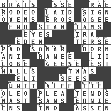 ACROSS 1. Naughty children 6. Compass dir. 9. Actress Charlotte 12. Cowboy competition 13. Put down 14. Signal 15. Baking chambers 16. Greek god of love 17. Double curve, resembling the letter S 18. Conclude 19. Comedian Laurel of Laurel & Hardy 20. Scottish caps 21. Sight organs 23. Lyricist Gershwin 24. Locale of original sin 25. Laconic 28. Writing tablet 30. Underwater navigation system 34. Dormintory (informal) 35. Black tropical American cuckoo 36. Indian princess (variant) 38. Cards in a Roman deck? 39. Ear part 41. Honkers 43. Eastern Standard Time (abbr.) 44. Promenades 46. It was, poetically 48. Biblical high priest 49. Perceives with the eye 50. A single undivided whole 51. Toward shelter 53. Make a knot 56. Butter sub 57. Entreaty 58. Watches over 60. Political cartoonist Thomas 61. Without 62. Bert's buddy 63. Followers of ems 64. Indiana (abbr.) 65. NE Netherlands city DOWN 1. Sis' sibling 2. Be footloose 3. Arabian gulf 4. Looked after 5. Mayday 6. "Two Mules for Sister ____" 7. The Jewish people; Israel 8. Begley and Asner 9. Frustrating wastes of time 10. Grows older 11. Compass dir. 13. Allows 14. Flew 19. Sir (Sp.) 20. Teat (slang) 22. It is so 24. The property of being fit to eat 26. Indian titles of respect 27. Send forth 28. Inside of hand 29. Small Philippine buffalo 31. Tired old horse 32. One (Scot) 33. To separate or throw off 37. First name in cosmetics 40. American author Paul (1891-1958) 42. She-sheep 45. Be seated 47. Michaelmas daisies 49. Oceans 50. ____ Bator, Mongolia 51. ____ Jay Lerner 52. Grant temporary use of 54. Restaurants 55. Singer Brickell 56. Single 57. Air pressure measure (abbr.) 58. Afternoon social gathering 59. Elected rep.