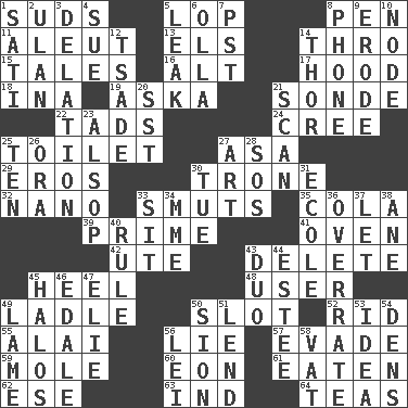 ACROSS 1. Soap bubbles 5. Chop off 8. Writing instrument 11. Eskimo relative 13. Raised railways 14. Through, poetically 15. Stories 16. The first octave above the treble staff 17. Parka part 18. _ tizzy (2 wds.) 19. "____ silly question..." 21. Message 22. Small amounts or degrees 24. Algonquian 25. Rest room 27. White ___ sheet 29. Greek god of love 30. Heavy duty weighing machine 32. Billionth: prefix 33. Particles of soot 35. Root beer relative 39. A-one 41. Baking chamber 42. Shoshoni 43. Erase 45. The bottom of a shoe or boot 48. One who makes use of a thing 49. Dipping utensil 50. Position in a hierarchy or organization 52. To free from 55. Jai ____ 56. Falsehood 57. Dodge 59. Undercover agent 60. Period of immesurable duration 61. Ingested 62. Compass dir. 63. Indiana (abbr.) 64. Beverages made from leaves DOWN 1. Suttee (variant) 2. ____ Bator, Mongolia 3. Accusation by an informer 4. Institute legal proceedings 5. Path through which fluid escapes 6. Water jar 7. Pacific Standard Time (abbr.) 8. Give a jingle 9. Eat (away) 10. Thickened enlargement 12. Sadhe (variant) 14. Son of Odin 20. Fast jet (abbr.) 21. Examine minutely or intensely 23. Columnist Joseph or Stewart 25. "___ Little Indians" 26. Mouth or opening 27. Nonscientific branch of learning 28. Distress signal 30. Third day of the wk. 31. Learning spot: Fr. 33. Be seated 34. Madame (abbr.) 36. Make much ado about nothing 37. Allow 38. A saturated hydrocarbon 40. General guideline 43. Superhero pair 44. First name in cosmetics 45. Radiant circles of light 46. Peak District village in England 47. Writer Wiesel 49. Unable to walk 50. The Jewish people; Israel 51. Grant temporary use of 53. The main thing one is thinking about 54. Cub Scout units 56. Luau accessory 58. Large container