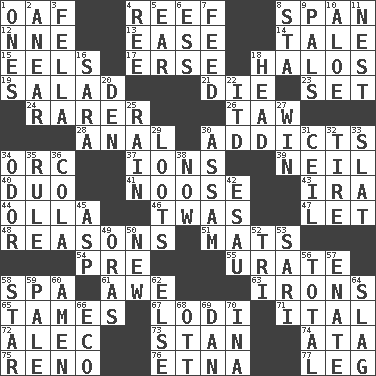 ACROSS 1. Clumsy lout 4. Coral ridge 8. Connect, as a bridge 12. Compass dir. 13. Relaxation 14. Lie 15. Snakelike fish 17. Celtic language 18. Saint headwear 19. Vegetable dish 21. Pass on 23. Put into a specified state 24. More uncommon 26. The 23rd letter of the Hebrew alphabet 28. Of or related to the anus 30. Inveterate users 34. The grampus (Milton) 37. Charged particles 39. Famous astronaut Armstrong 40. Superhero pair 41. Trap for birds or small mammals 43. Retirement account (abbr.) 44. Spanish pot 46. It was, poetically 47. Allow 48. Thinks logically 51. Floor coverings 54. Before (prefix) 55. A salt of uric acid 58. Health resort 61. Deep reverence 63. Removes the wrinkles 65. Corrects by punishment or discipline 67. Farming town in central California 71. Slanted text style (abbr.) 72. Actor Baldwin 73. Comedian Laurel of Laurel & Hardy 74. _ moment's notice (2 wds.) 75. Western Nevada city 76. Inactive volcano in Sicily 77. Part of a journey DOWN 1. Singles 2. Approach 3. Chap (slang) 4. To sift 5. Hearing organ 6. Double-curved letter 7. Nourish 8. R.R. building 9. Friends 10. Medicinal plant 11. A home for chicks 16. "Two Mules for Sister ____" 18. Froth on beer 20. Lair 22. It would 25. Precipitation 27. Acquire through effort 29. Plunders 30. Indian state 31. To provide with a ceiling 32. Hoop that covers a wheel 33. Narrow board 34. Scent 35. General guideline 36. Root beer relative 38. At this time 42. Son of Isaac 45. Cleo's killer 49. Mouths or openings 50. ___ Haven, CT 52. Three (prefix) 53. Indian skirt 56. Add up to 57. Maternal 58. Play the lead 59. Diluted with white 60. So be it 62. Otherwise 64. Volcanic refuse 66. Environmental prefix 68. Baseball player Mel 69. One of the 12 tribes of Israel 70. _ tizzy (2 wds.)