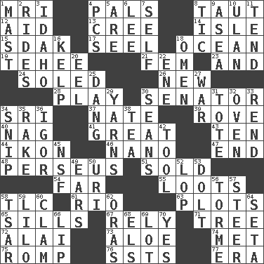 ACROSS 1. Medical imaging device (abbr.) 4. Friends 8. Strained 12. Assist 13. Algonquian 14. Small island 15. Neighbor of Neb. 17. Sew up the eyelids of hawks and falcons 18. Sea 19. Giggle 21. Opposite of masc. 23. Added to 24. Having a sole or soles 26. ___ Haven, CT 28. Shaw product 30. Legislator 34. Indian title of respect (Mr.) 37. Nathan's nickname 39. Be footloose 40. Tired old horse 41. Relatively large 43. Nine, plus one 44. Visual representation of an object 46. Billionth: prefix 47. Conclude 48. Son of Zeus who helped slay Medusa 51. Disposed of to a purchaser 54. At a great distance 55. Plunders 58. Affectionate concern, for short 61. River (Sp.) 63. Small pieces of grounds 65. Beverly of Met fame 67. Depend 71. Family _ (genealogy) 72. Mountain range southwest of Kyrgyzstan 73. Medicinal plant 74. Was introduced to 75. Frolic 76. Fast planes 77. Period DOWN 1. Vertical spar for supporting sails 2. Amusement-park features 3. Potato state 4. Personal Computers (abbr.) 5. "We ___ not amused" (Victoria) 6. Area sheltered from the wind 7. Oneself 8. Nervous spasm 9. At sea 10. ____ Bator, Mongolia 11. Be inclined (to) 16. Seaweed 18. Presage 20. Snakelike fish 22. Compass dir. 25. Mild oath, euphamism for damn 27. Armed conflict 29. Tall tales 30. Actors Connery and Penn 31. Carry 32. Baking chamber 33. Tear apart 34. Sever or remove by pinching or nipping 35. Immoral or dissolute person 36. Russian composer Stravinsky 38. Afternoon social gathering 42. Implement 45. Science/research agcy. 49. Hearing organs 50. RI univ. 52. Chop off 53. Dunce 56. Singer Mel 57. Navigate 58. Russian ruler of old 59. _ and Stitch 60. Burrowing marine mollusk 62. Mouths or openings 64. Bristle 66. Mouth edge 68. Raised railways 69. Car dealer's back yard 70. It is so