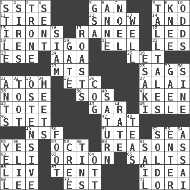 ACROSS 1. Fast planes 5. Separate the seeds from cotton 8. Ring climax 11. Hoop that covers a wheel 12. Frozen precipitation 14. Also 15. Removes the wrinkles 17. The wife of a rajah (variant) 18. Directed 19. Small, flat, pigmented spot on the skin 21. Pipe bend 22. French article 23. Compass dir. 24. Auto club (abbr.) 25. Allow 27. Mountains (abbr.) 28. Settles 31. Tiny particle 35. And so on (abbr.) 37. Jai _ 38. Characteristic smell of wine 39. Mayday 41. Peachy ____! 42. Haul 43. Slender fish 45. Small island 46. Proofreading order 47. Make lace 49. Science/research agcy. 51. Shoshoni 52. Ocean 55. It is so 57. Sep. follower 60. Thinks logically 62. Biblical high priest 63. Constellation of myth 65. Table seasonings 66. 54 in ancient Rome 67. Portable shelter 68. It may be bright or harebrained 69. Area sheltered from the wind 70. Eastern Standard Time (abbr.) 71. Australian parrot (variant) DOWN 1. Vertical member of a panel or frame 2. Fathers 3. Heavy duty weighing machine 4. Emitted 5. Girls' org. (abbr.) 6. Singer Murray 7. Christmas carol 8. Baron Munchausen's specialties 9. Leg joint 10. Probability 13. Water source 16. Thailand, formerly 17. Cooks with dry heat, as in an oven 20. Yard entry 26. 1973 Nobel Price Winner (Physics) Leo 29. Highlander 30. Trig term 31. Pismires 32. A blast of a horn 33. Clearly or manifestly demonstrative 34. Confronts 36. Gear tooth 40. Titan orbits this 44. Assign a rank or rating to 48. Afternoon social gatherings 50. Lowest support of a structure 52. Twentieth part of a lira 53. Keyboard key 54. Slender Brazilian palm 55. Shout 56. Writer Wiesel 58. Algonquian 59. Canisters 61. Travel by water 64. Baseball player Mel