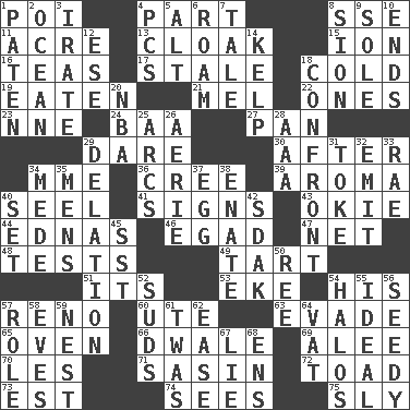 ACROSS 1. Luau course 4. Role in a play 8. Compass dir. 11. 1/640 square mile 13. Cover or conceal 15. Electrically charged atom 16. Beverages made from leaves 17. Lacking originality or spontaneity 18. Having a low temperature 19. Consumed 21. Cartoonist voice _ Blanc 22. Washington bills 23. Compass dir. 24. Sound made by sheep 27. Baking dish 29. Have the gumption 30. Following 34. Madame (abbr.) 36. Algonquian 39. Odor 40. Stitch closed the eyes of (a falcon) 41. Public displays of written messages 43. Migrant worker of the '30s 44. Ferber et al. 46. Mild oath 47. Remaining after all deductions 48. Trials 49. Small pie 51. It is 53. Make supply last 54. Part of HMS, perhaps 57. Former U.S. Attorney General Janet 60. Shoshoni 63. Elude 65. Baking chamber 66. A sleeping potion; an opiate (poet.) 69. Toward shelter 70. French article 71. Indian antelope 72. Frog relative 73. Eastern Standard Time (abbr.) 74. Observes 75. Secret DOWN 1. Eucharist need 2. Sea 3. Feeling or showing extreme anger 4. Personal Computers (abbr.) 5. The first octave above the treble staff 6. Wander 7. Falsehood 8. The Jewish people; Israel 9. Not divided or shared with others 10. Conclusions 12. Compass dir. 14. Seaweed 18. Meet 20. Basketball assoc. 25. Curves 26. Nest on high 28. American Automobile Association (abbr.) 29. Accusation by an informer 31. Puff or smoke 32. Give off 33. Actress Charlotte 34. Ancient Persian 35. Not women's 37. Ovum 38. Related on the mother's side 40. Arrange properly for use 42. Neighbor of Neb. 45. Fast jet (abbr.) 50. To sift 52. Beer foam 54. Saint headwear 55. Standard of perfection 56. Full of seeds 57. Hero or heavy, e.g. 58. Nights before holidays 59. A home for chicks 61. It was, poetically 62. Comfort 64. Large container 67. Untruth 68. Followers of ems
