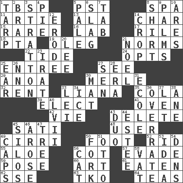 ACROSS 1. Cook's measure (abbr.) 5. Pacific Standard Time (abbr.) 8. Health resort 11. Nick name for Arthur 13. According to 14. Burn to charcoal 15. More uncommon 16. Experiment locale 17. Cause heat under the collar 18. Parent Teacher Association (abbr.) 19. Cassini of fashion 21. Typical models 22. Event that recurs at intervals 24. Elects 25. Main course 27. Perceive with the eye 29. Small Philippine buffalo 30. Haggard of country music 32. Monthly bill 33. Woody, climbing, usually tropical plant 35. Root beer relative 39. Choose 41. Baking chamber 42. Compete 43. Erase 45. Suttee (variant) 48. One who uses or employs something 49. High-altitude cloud 50. Pick up the tab 52. To free from 55. _ vera 56. Small bed 57. Dodge 59. Airs 60. Tate display 61. Ingested 62. Compass dir. 63. Ring climax 64. Afternoon social gatherings DOWN 1. Canvas cover 2. Naughty child 3. Ski resort town in Vermont 4. Sliced dessert 5. Light colored 6. Volcanic refuse 7. Bar bill 8. Chest covering 9. Insides of hands 10. Ancient Greek god of war 12. Eat (away) 14. Riding implement 20. Area sheltered from the wind 21. Christmas carol 23. Feeling or showing extreme anger 25. Hearing organ 26. Compass dir. 27. Elected rep. 28. Period 30. Floor protector 31. Learning spot: Fr. 33. Luau accessory 34. Frozen water 36. Make much ado about nothing 37. Allow 38. A saturated hydrocarbon 40. 57 in ancient Rome 43. Superhero pair 44. First name in cosmetics 45. Grain storage towers 46. Came up 47. Family _ (genealogy) 49. Smile enhancers 50. Tined utensil 51. "Beetle Bailey" pooch 53. The content of cognition 54. Hiding places for outlaws 56. Feline 58. Large container