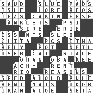 ACROSS 1. Saudi Arabian king (1953-1964) 5. Change direction abruptly 9. Groovy apts. 13. Small island 14. Old wives' tales, e.g. 15. Vintage cars 16. Afternoon social gatherings 17. Apartment or room in a ship 18. Celtic language 19. Short socks 21. 23rd letter of the Greek alphabet 22. Male parent of an animal 23. 4th largest of the Great Lakes 24. Curvy letter 27. Mountains (abbr.) 28. Downhill vehicle 29. Riviera of "Kiss of the Spider Woman" 31. Personal Computers (abbr.) 32. Inactive volcano in Sicily 36. Have trust in 37. Luau course 38. Famous astronaut Armstrong 39. One who uses or employs something 40. Domesticated feline 41. Lacking originality or spontaneity 42. Northwest Algerian city 44. Chief or king in Benin or Nigeria 46. To separate or throw off 47. Painful 48. Monthly bill 50. _ de Janeiro 51. Thinks logically 54. Moved rapidly 56. Hold, grip (Informal) 58. Whine 60. Painter Guido (1575-1642) 61. Floor coverings 62. Aroma 63. SW Asia republic 64. Medicinal plant 65. Stalk of a moss capsule DOWN 1. Be seated 2. At sea 3. ____ Bator, Mongolia 4. Writing tables 5. Chalkboards 6. Tennis shots 7. RI univ. 8. Car or cant ending 9. Elected leader of a country 10. Nest on high 11. Two (Sp.) 12. Compass dir. 17. Certainty 20. Pale green bean 21. Before (prefix) 23. Raised railways 24. Shade of tan 25. "______ My Girl" (Turtles hit) 26. Filth; sediment 28. _-fi 30. Polypeptide antibiotic 31. Cooking vessel 33. Pull into pieces 34. Mediterranean tributary 35. Toward shelter 37. Baking dish 40. Island 41. Without 43. 17th letter of the Greek alphabet 44. Threatening words 45. Necklace unit 47. Sports stadium 49. Literary convention 51. Printing process, for short 52. Naked 53. Position in a hierarchy or organization 54. _ Lanka 55. For each 56. Nursemaid (var.) 57. Actor Linden 59. Epoch