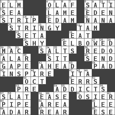 ACROSS 1. Shade tree 4. Norwegian king 8. Suttee (variant) 12. Ocean 13. Unable to walk 14. Genesis locale 15. Empty completely 18. Dutch treat 19. Grandmother 20. Slender, wiry 22. Scottish cap 23. Bristle 24. Erode 25. Like a shrinking violet 26. Shoved, as through a crowd 30. Big _ 33. Table seasonings 36. Make new 37. Having or resembling wings 39. Be seated 40. Post 41. Yawn 42. At or in the front 44. Writing tablet 45. Motivate 47. Call ___ day 50. Sep. follower 51. Blunders 53. Before (prefix) 54. Inveterate users 57. Narrow board 59. Relaxation 61. Flexible twig of a willow tree 63. Corncob 64. Length times width 65. Area sheltered from the wind 66. The sixth month of the Jewish calendar 67. Bring up, as a child 68. Compass dir. DOWN 1. Curvy letter 2. Allows 3. Shops 4. Cassini of fashion 5. Kenny Rogers chart-topper in '80 6. Housemaid (var.) 7. Opposite of masc. 8. Elected representatives 9. First man 10. "___ Little Indians" 11. _ tizzy (2 wds.) 16. Angers 17. Heart or essence 21. Negative votes 22. Bar bill 24. Raised railways 26. Singer James 27. Shed a tear 28. Pulitzer Prize-winning author Ferber 29. Texas town _ City 30. Wise men 31. ____ Jay Lerner 32. Smile enhancers 34. American tennis player Robert 35. Whopper 38. Newsperson 42. Tate display 43. Passed on 46. Frozen water 48. Musical group of three 49. Curves 52. Vertical member of a panel or frame 53. Dad 54. At sea 55. Letter starter 56. Observes 57. Health resort 58. Hat (slang) 59. Ewer handle 60. "We ___ not amused" (Victoria) 62. To sift