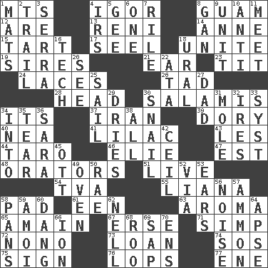 ACROSS 1. Mountains (abbr.) 4. Russian composer Stravinsky 8. Island territory of the United States 12. "We ___ not amused" (Victoria) 13. Painter Guido (1575-1642) 14. Queen of England 1702-14 15. Small pie 17. Sew up the eyelids of hawks and falcons 18. Join together 19. Founders of families 21. Ewer handle 23. Teat (slang) 24. Shoestrings 26. Small amount or degree 28. Froth on beer 30. Deli grouping 34. It is 37. SW Asia republic 39. Small, narrow, flatbottom fishing boat 40. Teachers' org. 41. Pale purple color 43. French article 44. Pacific island yam 46. Writer Wiesel 47. Eastern Standard Time (abbr.) 48. Speakers 51. Not recorded 54. Federal power corp. 55. Climbing, woody, usually tropical vines 58. Groovy apt. 61. Car or cant ending 63. Odor 65. With great haste 67. Celtic language 71. Simple or foolish person 72. Words to Nanette 73. Grant temporary use of 74. Distress signal 75. Signal 76. Chops off 77. Compass dir. DOWN 1. Floor protectors 2. Get behind 3. Spanish missionary in California 4. Big collection agency 5. Turn to the right 6. Single 7. Cause heat under the collar 8. Separate the seeds from cotton 9. A single undivided whole 10. Opposed to 11. Rendezvous 16. Technical work 18. Mountain range 20. Perceive with the eye 22. "One Day ___ Time" 25. Move on water 27. June honoree 29. Frees from moisture 30. Slow-paced one 31. Undercover agent 32. Angers 33. System (abbr.) 34. To the inside or interior of 35. Pull apart 36. "Two Mules for Sister ____" 38. 100% 42. To provide with a ceiling 45. Baseball player Mel 49. Baking chamber 50. Actress Charlotte 52. By way of 53. Hearing organs 56. Annoying sound 57. ID or VA city 58. Baking dishes 59. Mine, in Marseilles 60. Mild oath, euphamism for damn 62. 1994 drama film starring Jodie Foster 64. Domed church section 66. Electrically charged atom 68. Friend of Pooh 69. Plant excrement 70. Followers of ems
