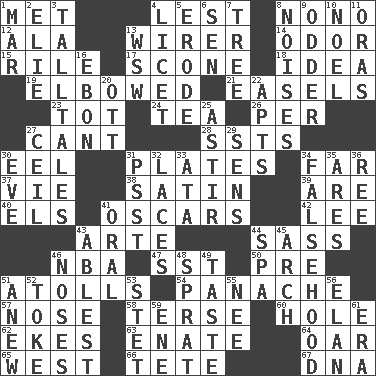 ACROSS 1. Was introduced to 4. For fear that 8. Words to Nanette 12. Chicken ___ king 13. One who wires 14. Scent 15. Cause heat under the collar 17. Biscuitlike quick bread 18. It may be bright or harebrained 19. Turned at an angle; bent 21. Artist's stands 23. Small child 24. Beverage made from leaves 26. For each 27. Patter 28. Fast planes 30. Snakelike fish 31. Food holders 34. Distant 37. Compete 38. Smooth fabric 39. "We ___ not amused" (Victoria) 40. Raised railways 41. Motion picture awards 42. Area sheltered from the wind 43. Johnson of "Laugh-In" 44. Backtalk 46. Basketball assoc. 47. Fast jet (abbr.) 50. Before (prefix) 51. Ringlike coral islands and reefs 54. Flamboyance 57. Sense of smell 58. Laconic 60. Opening into or through something 62. Makes supply last 63. Maternal 64. Rowing implement 65. Compass direction 66. False hair 67. Heredity factor (abbr.) DOWN 1. Spoil 2. Writer Wiesel 3. Baron Munchausen's specialties 4. It is permitted: Lat. 5. Wear away 6. Elected rep. 7. Family _ (genealogy) 8. Annoying sounds 9. More peculiar 10. Christmas carol 11. Mouths or openings 13. Compass dir. 16. Inky black, to poets 20. Baseball player Mel 22. Tenement units (abbr.) 25. Moving or stirring 27. To provide with a ceiling 29. Elected reps. 30. First lady 31. Inconspicuous attention getter 32. Shoestrings 33. "One Day ___ Time" 34. It jiggles the polygraph 35. Ancient Greek god of war 36. To separate or throw off 41. Spoken 43. Most capable 44. Health resort 45. Bowlike part 46. Olfactory organs 48. Small fatty European fish 49. Clothes sense 51. Afresh 52. Casino tip 53. Proofreading order 55. Born 56. Style 59. Compass dir. 61. Epoch