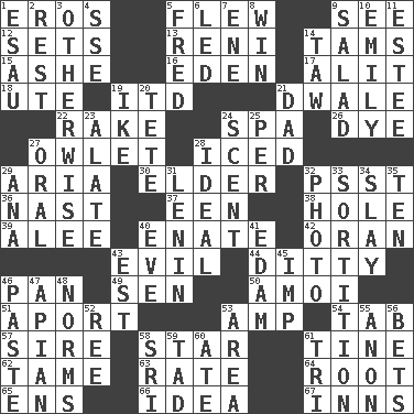 ACROSS 1. Greek god of love 5. Soared 9. Observe 12. Puts into a specified state 13. Painter Guido (1575-1642) 14. Scottish caps 15. American tennis player Robert 16. Locale of original sin 17. Came down and settled, as after flight 18. Shoshoni 19. It would 21. A sleeping potion; an opiate (poet.) 22. Libertine 24. Health resort 26. Color 27. A small or young owl 28. On the rocks 29. Roberta Peters solo 30. A person who is older than you are 32. Inconspicuous attention getter 36. Political cartoonist Thomas 37. Car or cant ending 38. Opening into or through something 39. Toward shelter 40. Maternal 42. NW Algerian seaport 43. Tending to cause great harm 44. Short, simple song 46. Baking dish 49. Elected rep. 50. Mine, in Marseilles 51. To the left, to Queeg 53. Electrical Unit 54. Keyboard key 57. Male parent of an animal 58. Play the lead 61. Prong on a fork 62. Not wild 63. Assign a rank or rating to 64. Carrot, for example 65. Followers of ems 66. The main thing one is thinking about 67. Restaurants DOWN 1. He sold his birthright 2. Remainder 3. Else 4. Compass dir. 5. Flintstone 6. Directed 7. Compass dir. 8. Acquire through effort 9. First course 10. Poet Dickinson 11. First name in cosmetics 14. The 23rd letter of the Hebrew alphabet 19. D.D.E's nickname 20. Wig 21. Male parent 23. Having winglike extensions 24. Aroma 25. For each 27. Spoken 28. Standard of perfection 29. Santa ___, CA 31. Soviet premier 1918-24 32. Picture 33. Conclusion 34. Kill 35. "___ Little Indians" 40. Night before a holiday 41. Dutch treat 43. Eastern Standard Time (abbr.) 45. Naughty child 46. Thick mixture 47. Bee-related 48. Typical models 52. To sift 53. Length times width 55. Soon (poet.) 56. Stakes 58. _ Lanka 59. Small amount or degree 60. Had dinner 61. Three (prefix)