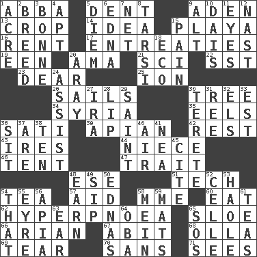 ACROSS 1. Swedish rock group 5. Gouge 9. An important port of Yemen 13. Riding implement 14. The content of cognition 15. Beach, in Buenos Aires 16. Monthly bill 17. Pleas 19. Car or cant ending 20. Housemaid (var.) 21. _-fi 22. Fast jet (abbr.) 23. Letter starter 25. Electrically charged atom 26. Moves on water 30. Family _ (genealogy) 34. Damascus' land 35. Snakelike fish 36. Suttee (variant) 39. Bee-related 42. Take ten 43. Angers 44. Sibling's daughter 46. Portable shelter 47. Distinguishing feature 48. Compass dir. 51. Technical 54. Afternoon social gathering 57. Help 58. Madame (abbr.) 60. Erode 62. Abnormally rapid or deep breathing 65. A type of plum 66. Believer in; advocate of (suffix) 67. "This won't hurt ____!" 68. Spanish pot 69. Pull into pieces 70. Without 71. Perceives with the eye DOWN 1. 43,560 square feet 2. A special lineage 3. Child's nurse 4. Fitting 5. South Vietnam president (1954) 6. Pulitzer Prize-winning author Ferber 7. Fish or hair follower 8. Tarsus (plural) 9. Keyboard modifier key 10. Raised platform 11. Sight organs 12. Political cartoonist Thomas 15. Ache 18. Environmental prefix 20. Like ___ of sunshine 24. Help 27. Lyricist Gershwin 28. Mouth edge 29. Virtuous person 30. Cigar-shaped 31. To riddle 32. Raised railways 33. Eastern Standard Time (abbr.) 36. Be seated 37. "We ___ not amused" (Victoria) 38. Nine, plus one 40. Wind 41. Teachers' org. 45. Quote 48. Merit 49. Small drink 50. Ferber et al. 52. Cell (Danish) 53. White Person, in Hawaii 54. Not this but _ 55. Jane of fiction 56. Capital of Western Samoa 58. Chow _ 59. Floor protectors 61. Afternoon social gatherings 63. Hearing organ 64. Chief or king in Benin or Nigeria 65. Mayday