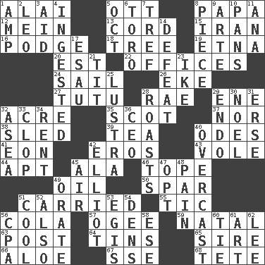 ACROSS 1. Jai ____ 5. Baseball player Mel 8. Dad 12. Count _ (2 wds.) 13. Drawstring 15. SW Asia republic 16. Plash 18. Family _ (genealogy) 19. Inactive volcano in Sicily 20. Eastern Standard Time (abbr.) 22. Places of business 24. Travel by water 26. Supplement with great effort 27. Ballerina skirt 28. Actress Charlotte 29. Compass dir. 32. Land measure 35. Native of Scotland 37. Not either 38. Downhill vehicle 39. Beverage made from leaves 40. Lyric poems 41. A really long time 42. Greek god of love 43. Short-tailed, large-bodied rat 44. Fitting 45. Wing 46. Drink excessively 49. Lubricate 50. Coast Guard woman 51. Borne 55. Nervous spasm 56. Root beer relative 57. Double curve, resembling the letter S 59. Relating to or accompanying birth 63. Mail 64. Airtight sealed metal containers 65. Beget 66. _ vera 67. Compass dir. 68. False hair DOWN 1. Electrical Unit 2. Lion 3. Assist 4. Consumed 5. Sep. follower 6. "Corrida" creature 7. Unclean, religiously 8. Part 9. Johnson of "Laugh-In" 10. Baking dishes 11. Santa ___, CA 14. Outscore 17. Son of Isaac 21. Teat (slang) 23. Mamie's husband 25. A period of five years 28. Cooks with dry heat, as in an oven 29. Inside; within (prefix) 30. Christmas carol 31. Celtic language 32. At sea 33. Hoof sound 34. Monthly bill 36. Corporate head (abbr.) 40. Cloudy 42. American author Paul (1891-1958) 45. Wind 47. Choose 48. Ache 49. Declaim 51. Calm and collected 52. In addition 53. Armor plate that protects the chest 54. Hiding places for outlaws 56. Accounting whiz (abbr.) 58. Compass dir. 60. Neckwear 61. Tate display 62. Area sheltered from the wind
