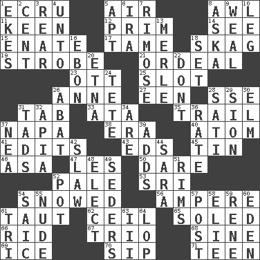 ACROSS 1. Shade of tan 5. Atmosphere 8. Leather borer 11. Peachy ____! 12. Demure 14. Observe 15. Related on the mother's side 17. Docile 18. Heroin 19. Disco prop 21. Severe or trying experience 23. Baseball player Mel 25. Narrow, elongated depression 26. Queen of England 1702-14 27. Car or cant ending 28. Compass dir. 31. Keyboard key 33. _ moment's notice (2 wds.) 35. Lag or linger behind 37. California wine valley 38. Period 40. Smallest unit of an element 41. Proofreads 43. Begley and Asner 45. Shallow baking pan 46. White ___ sheet 47. French article 50. Have the gumption 52. Diluted with white 53. _ Lanka 54. Overwhelmed 56. Electrical Unit 61. Tense 62. To provide with a ceiling 65. Having a sole or soles 66. To free from 67. Musical group of three 68. Trig term 69. Frozen water 70. Small drink 71. Adolescent DOWN 1. Makes supply last 2. Penny 3. Located in or toward the back 4. To (old English) 5. Fitting 6. Retirement account (abbr.) 7. Full of chinks, cracks, or crevices 8. "____ silly question..." 9. Welt 10. Part of a journey 13. Haggard of country music 16. Inky black, to poets 18. Put into a specified state 20. Inactive volcano in Sicily 22. Do not 24. Wig 26. Blind as ____ 28. Suttee (variant) 29. The Jewish people; Israel 30. Shade tree 31. Small amounts or degrees 32. Capital of Western Samoa 34. "We ___ not amused" (Victoria) 36. Pace 37. Teachers' org. 39. Sums up 42. Cole _ (cabbage dish) 44. "Two Mules for Sister ____" 48. Opt 49. Spring feasts 51. Basketball hoops 52. Plant holder 54. Ketch in the Levant 55. Naked 57. Mail 58. Writer Wiesel 59. French philosopher Descartes 60. Paradise 61. Three (prefix) 63. One more than two 64. Trim (branches)
