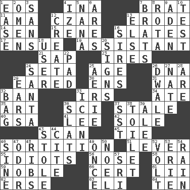 ACROSS 1. Greek goddess of the dawn 4. _ tizzy (2 wds.) 7. Naughty child 11. Nanny (var.) 12. Russian ruler of old 13. Eat (away) 14. Elected rep. 15. French philosopher Descartes 16. Chalkboards 17. Follow as a consequence or result 19. Aide 21. Plant excrement 23. Angers 24. Stalk of a moss capsule 25. Mature 26. Heredity factor (abbr.) 29. Having ears or earlike features 30. Followers of ems 31. Armed conflict 32. Forbid 33. Big collection agency 34. Had dinner 35. Tate display 36. _-fi 37. Having lost freshness 40. Girls' org. (abbr.) 41. Area sheltered from the wind 42. Flatfish 43. Skim 45. Make a knot 46. Conclusion 51. Crowbar 55. Foolish or stupid persons 56. Characteristic smell of wine 58. Mouth or opening 59. Having high moral qualities 60. An absolute certainty 61. Cards in a Roman deck? 62. Celtic language 63. Biblical high priest 64. "___ Little Indians" DOWN 1. Comfort 2. Sign of something about to happen 3. Without 4. Ending with capital 5. Nanny 6. Ancient Greek god of war 7. Naughty children 8. Round or rotation of duties 9. Arabian gulf 10. Trial 12. Cause to be 13. Otherwise 16. Male parents of animals 18. One who makes use of a thing 20. Signals 22. Groovy apt. 24. Before Barbara or Clara 25. Nest on high 26. A sleeping potion; an opiate (poet.) 27. Nathan's nickname 28. "We ___ not amused" (Victoria) 29. Hearing organs 32. Paper or plastic container 33. Ancient Celtic tribe of eastern Britain 36. Narrow boards 37. Fast jet (abbr.) 38. Bathroom plumbing fixture 39. Toward shelter 43. Took without asking 44. Quote 46. Trig term 47. Aroma 48. Chest bones 49. At one time in the past 50. Christmas carol 52. Electrical Unit 53. One of the Great Lakes 54. Precipitation 57. _ Lanka