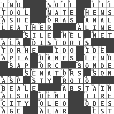 ACROSS 1. Working for oneself (abbr.) 4. The visible part of the earth's surface 8. Cards in a Roman deck? 11. Instrument 13. Nathan's nickname 14. Coop moms 15. American tennis player Robert 16. Mouths or openings 17. Of or related to the anus 18. Cordwainer's material 21. Place in a line 22. Drop; flow; fall 23. Cartoonist voice _ Blanc 25. Remaining after all deductions 26. Insect wing 29. What propaganda does 32. Singer Mel 34. Wedding promise 35. Binary compound 38. Capital of Western Samoa 39. Natives or inhabitants of Denmark 41. Grant temporary use of 43. Plant excrement 44. The grampus (Milton) 45. Message 46. Elected representatives 50. Boy, to dad 51. Cleo's killer 54. Filthy place 55. Printing process, for short 57. Memphis, Tenn. Street 59. Refrain by choice 63. In addition 64. Undesirable depression on a surface 67. Become fatigued 68. Municipality 69. Butter sub 70. Lyric poems 71. Grow older 72. Having or resembling wings 73. Eastern Standard Time (abbr.) DOWN 1. Slanted text style (abbr.) 2. Sense of smell 3. Capital of the state of Qatar 4. Sounds asleep 5. Boat paddle 6. Call ___ day 7. French article 8. Soviet premier 1918-24 9. Empty; void 10. Small island 12. Allows 14. Actor Linden 19. Flintstone garb 20. Biblical high priest 21. Keyboard modifier key 23. Method 24. Greek god of love 26. _ moment's notice (2 wds.) 27. Chops off 28. Roberta Peters solo 30. A color or tint 31. Grain storage tower 33. Atlas contents 36. Habitations of wild animals 37. Inside; within (prefix) 39. Do not 40. Like ___ of sunshine 42. Lair 45. Fast planes 47. Compass dir. 48. Speaker 49. Director Reiner 51. Phillipine bananalike plant 52. Major League Baseball Commissioner Bud 53. Thick mixture 56. "Beetle Bailey" pooch 58. Myrna of the movies 60. Helper 61. Angers 62. Egg locale 64. ___ good deed 65. Pipe bend 66. Teachers' org.