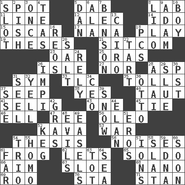 ACROSS 1. Blemish 5. Small moist lump or mass 8. Experiment locale 11. Actor's bit 12. Actor Baldwin 14. Wedding promise 15. Motion picture award 17. Grandmother 18. Shaw product 19. College papers 21. "Cheers" or "Ellen" 23. Boat paddle 25. Mouths or openings 26. Capri or Wight 27. And not 28. Viper 31. Symbol (abbr.) 33. Affectionate concern, for short 35. For Whom the Bell _____ 37. Ooze 38. Affirmative reply 40. Strained 41. Major League Baseball Commissioner Bud 43. Single 45. Make a knot 46. Pipe bend 47. To separate or throw off 50. Margarine 52. Polynesian shrub of the pepper family 53. Armed conflict 54. College paper 56. Annoying sounds 61. Toadlike animal 62. Allows 65. Twentieth part of a lira 66. Direct toward a target or goal 67. _ gin 68. Billionth: prefix 69. Friend of Pooh 70. R.R. building 71. Comedian Laurel of Laurel & Hardy DOWN 1. Slit 2. Expression of disdain 3. At one time in the past 4. Afternoon social gatherings 5. One of the 12 tribes of Israel 6. Insect wing 7. Gillaume's butler role 8. _ and Stitch 9. First of billions? 10. Male child 13. Capital of Egypt 16. Vintage cars 18. Personal Computers (abbr.) 20. Table seasoning 22. Small pie 24. Trust 26. Body of Kaffir warriors 28. Mountain range southwest of Kyrgyzstan 29. Turn sharply 30. Pacific Standard Time (abbr.) 31. Sew up the eyelids of hawks and falcons 32. Shout 34. Corporate head (abbr.) 36. Von Bismarck 37. Compass dir. 39. Frozen precipitation 42. Pate de foie ____ 44. Enthusiasm 48. Vices 49. Artist's stands 51. Greek god of love 52. Cask 54. Musical group of three 55. Same (prefix) 57. Charged particles 58. Narrow board 59. Pulitzer Prize-winning author Ferber 60. Within a short period 61. Distant 63. Small child 64. Ocean