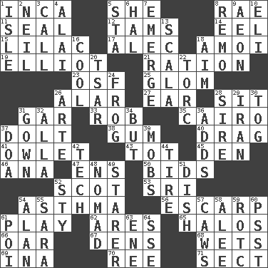 ACROSS 1. South American Indian 5. A female animal or person 8. Actress Charlotte 11. Lick closed 12. Scottish caps 14. Snakelike fish 15. Pale purple color 17. Actor Baldwin 18. Mine, in Marseilles 19. American author Paul (1891-1958) 21. Food allowance for one day 23. Order of Saint Francis (abbr.) 25. Take by theft 26. Having or resembling wings 27. Ewer handle 28. Be seated 31. Slender fish 33. Director Reiner 35. Capital of Egypt 37. Stupid person 38. Chewing product 40. To trail on the ground 41. A small or young owl 43. Small child 45. Lair 46. Santa ___, CA 47. Followers of ems 50. Auction offers 52. Native of Scotland 53. _ Lanka 54. Respiratory problem 56. Fortification 61. Live dramatic performance 62. Ancient Greek god of war 65. Radiant circles of light 66. Rowing implement 67. Cub Scout units 68. Moistens 69. _ tizzy (2 wds.) 70. To separate or throw off 71. Religious group DOWN 1. Small island 2. Famous astronaut Armstrong 3. Give a ring to 4. Jai ____ 5. R.R. building 6. Actor Linden 7. Develop 8. San ____ (Riviera town) 9. A really long time 10. Biblical high priest 13. Any of the three canals of the cochlea 16. Calm and collected 18. Direct toward a target or goal 20. Russian ruler of old 22. Torque (variant) 24. Tree-dwelling hopper 26. Johnson of "Laugh-In" 28. The founder of a family 29. SW Asia republic 30. Coat; cloak 31. Bride's dress 32. Silent film actress Nazimova 34. Yet 36. Does sums 37. ___ good deed 39. Disorderly crowds 42. Technical 44. Become fatigued 48. Roamer 49. A viewer who gazes fixedly 51. Food container 52. Filthy place 54. ____ Jay Lerner 55. "Two Mules for Sister ____" 57. Crow sounds 58. Toward shelter 59. College mil. group 60. Inconspicuous attention getter 61. Luau course 63. Compass dir. 64. Compass dir.
