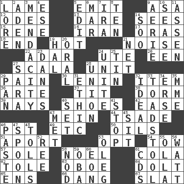 ACROSS 1. Unable to walk 5. Give off 9. White ___ sheet 12. Lyric poems 13. Have the gumption 14. Observes 15. French philosopher Descartes 16. SW Asia republic 17. Mouths or openings 18. Conclusion 19. Being at a high temperature 21. Annoying sound 22. The sixth month of the Jewish calendar 24. Shoshoni 26. Car or cant ending 27. Any of the three canals of the cochlea 28. A single undivided whole 29. Ache 30. Soviet premier 1918-24 32. A whole individual unit 36. Johnson of "Laugh-In" 37. Teat (slang) 38. Dormintory (informal) 39. Negative votes 40. Imelda's hoard 42. Comfort 43. Chow _ 44. Sadhe (variant) 46. Pacific Standard Time (abbr.) 49. And so on (abbr.) 50. Petroleums 51. To the left, to Queeg 53. Elect 54. Pull behind 57. Not divided or shared with others 58. Christmas carol 61. Root beer relative 62. Lacquered or enameled metalware 63. Mitch Miller's instrument 64. Stupid person 65. Followers of ems 66. Mild oath, euphamism for damn 67. Narrow board DOWN 1. Old wives' tales, e.g. 2. An important port of Yemen 3. Ananias' fault 4. Compass dir. 5. Prepare for publication 6. Spoil 7. Lyricist Gershwin 8. Nine, plus one 9. Nest on high 10. Gospel singer Marvin 11. NE Netherlands city 14. "Barney Miller" actor Jack 19. Actor Linden 20. Relating to the mouth 21. Remaining after all deductions 23. Natives or inhabitants of Denmark 24. Join together 25. Shallow baking pan 27. "Two Mules for Sister ____" 28. The state of being joined or united 29. Baking dish 31. Value system 32. Perfect 33. Inedible or poisonous agaric 34. Celtic language 35. Madame (abbr.) 40. Put into a specified state 41. Cease 43. Was introduced to 45. Be seated 46. Thick mixture 47. Soup utensil 48. For Whom the Bell _____ 52. Portuguese money of account (variant) 53. Cassini of fashion 55. Water jar 56. Electrical Unit 58. Allow head to fall sleepily 59. Chief or king in Benin or Nigeria 60. Period of immesurable duration 61. Music discs