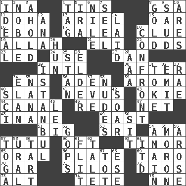 ACROSS 1. _ tizzy (2 wds.) 4. Airtight sealed metal containers 8. Girls' org. (abbr.) 11. Capital of the state of Qatar 13. Satellite of Uranus 15. Boat paddle 16. Inky black, to poets 17. An organ shaped like a helmet 18. A slight indication 19. Assad's deity 21. Connecticut Ivy Leaguer 22. Likelihood 23. Directed 24. Purpose 27. Daniel's nick name 29. International (abbr.) 30. Following 34. Followers of ems 36. Arabian gulf 39. Scent 40. Narrow board 41. Congenital growth or mark on the skin 43. Migrant worker of the '30s 44. Lessep's creation 46. Do over again 47. Fish or hair follower 48. Lacking in sense or substance 49. 90 degrees 51. Large 53. _ Lanka 54. Nursemaid (var.) 57. Ballerina skirt 60. Often (poetically) 63. The easternmost of the Lesser Sundas 65. Relating to the mouth 66. Food holder 69. Pacific island yam 70. Slender fish 71. Grain storage towers 72. "Vaya con ____" 73. Keyboard modifier key 74. Wig 75. Compass dir. DOWN 1. Standard of perfection 2. Having high moral qualities 3. Hold, grip (Informal) 4. Label 5. Retirement account (abbr.) 6. Mediterranean tributary 7. Stitch closed the eyes of (a falcon) 8. Aureate 9. Saudi Arabian king (1953-1964) 10. Ancient Greek god of war 12. Santa ___, CA 14. Put down 18. Meet 20. Attila the _ 25. Comedian Laurel of Laurel & Hardy 26. A person who is older than you are 28. American Automobile Association (abbr.) 29. Byzantium, centuries later 31. Puff or smoke 32. Give off 33. Actress Charlotte 34. Style 35. Nanny 37. First lady 38. Unadorned figures 40. _-fi 42. Fly high 45. Luau accessory 50. Be seated 52. Republicans 54. With great haste 55. Person of subnormal intelligence 56. Came up 57. Ancient Roman robe 58. Mountain range 59. Small pie 61. Secret move to avoid paying debts 62. Story 64. It would 67. Small child 68. Compass dir.