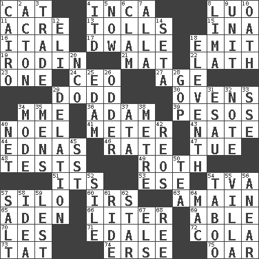 ACROSS 1. Feline 4. South American Indian 8. Nilotic language 11. Land measure 13. For Whom the Bell _____ 15. _ tizzy (2 wds.) 16. Slanted text style (abbr.) 17. A sleeping potion; an opiate (poet.) 18. Send forth 19. "The Thinker" sculptor 21. Floor protector 22. Thin strip of wood or metal 23. Single 24. Corporate head (abbr.) 27. Personal question 29. Texas town _ City 30. Baking chambers 34. Madame (abbr.) 36. First of billions? 39. Mexican monetary units 40. Christmas carol 41. Distance measurement 43. Nathan's nickname 44. Ferber et al. 46. Pace 47. Third day of the wk. 48. Trials 49. Writer of Portnoy's Complaint (1969) 51. It is 53. Compass dir. 54. Federal power corp. 57. Grain storage tower 60. Big collection agency 63. With great haste 65. Arabian gulf 66. 61 cubic inches 69. Competent 70. French article 71. Peak District village in England 72. Root beer relative 73. Make lace 74. Celtic language 75. Boat paddle DOWN 1. Capital of Egypt 2. Gambison 3. Swap 4. It would 5. Immediately 6. Burrowing marine mollusk 7. Silent film actress Nazimova 8. Pale green bean 9. A single undivided whole 10. Pledge 12. Connecticut Ivy Leaguer 14. Stalk of a moss capsule 18. Veterans Day date 20. Non-commissioned officer (abbr.) 25. Dutch treat 26. More peculiar 28. Grand Old Party 29. Accusation by an informer 31. He sold his birthright 32. Musical sound 33. Compass dir. 34. Method 35. Not women's 37. _ moment's notice (2 wds.) 38. Distance measurement (Brit.) 40. Remaining after all deductions 42. Vintage cars 45. Fast jet (abbr.) 50. Afternoon social gathering 52. Filth; sediment 54. Off limits 55. Country residence 56. Approach 57. Table seasoning 58. The main thing one is thinking about 59. For fear that 61. Travel on an animal 62. Play the lead 64. Apple computer (short form) 67. Raised railways 68. To separate or throw off