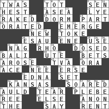 ACROSS 1. It was, poetically 5. Small child 8. Elected rep. 11. Command 12. Toward the sea 14. Potassium hydroxide 15. Swept the length of 17. Dormintory (informal) 18. Piece 19. Spoke pompously 21. Develop 23. ___ Haven, CT 25. Casino tip 26. He sold his birthright 27. Compass dir. 28. Purpose 31. Tired old horse 33. 17th letter of the Greek alphabet 35. Administered medicine 37. Indonesian resort city 38. Shoshoni 40. Wagers 41. Came up 43. Federal power corp. 45. Mouth or opening 46. Adept person 47. Born 50. Celtic language 52. Pulitzer Prize-winning author Ferber 53. Put into a specified state 54. Sunflower state 56. Flew 61. Old (Scot.) 62. Pull into pieces 65. First-year military academy student 66. To riddle 67. Otherwise 68. Soon (poet.) 69. Definite Article 70. Declare 71. Monthly bill DOWN 1. Through, poetically 2. Put on (as clothing) 3. "____ silly question..." 4. Proofreading order 5. Small amount or degree 6. Bear (Spanish) 7. Cigar-shaped 8. Volcanic refuse 9. Jane of fiction 10. Fish or hair follower 13. ID or VA city 16. Hiding places for outlaws 18. Before (prefix) 20. Letter starter 22. Supplemented with great effort 24. Chinese city south-southwest of Nanjing 26. The front part of a cuirass 28. One who makes use of a thing 29. Bristle 30. Begley and Asner 31. Drug cop 32. _ vera 34. Baseball player Mel 36. Mitch Miller's instrument 37. Sound made by sheep 39. Nights before holidays 42. Extremities 44. Ancient Greek god of war 48. Related on the mother's side 49. Artist's stands 51. Obstruct or block passage 52. Conclusion 54. Malaysian steamed pastry 55. Toward shelter 57. Having or resembling wings 58. French philosopher Descartes 59. Inky black, to poets 60. Gouge 61. Tate display 63. White ___ sheet 64. Marina Del _, California