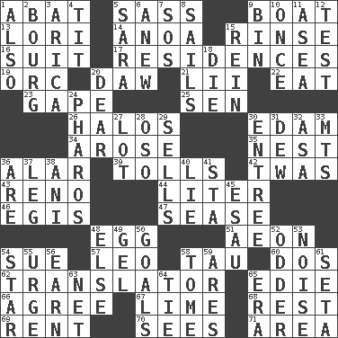 ACROSS 1. Blind as ____ 5. Backtalk 9. Water vessel 13. Australian parrot (variant) 14. Small Philippine buffalo 15. Remove soap 16. Set or collection 17. Homes 19. The grampus (Milton) 20. Simpleton 21. Cards in a Roman deck? 22. Consume 23. Yawn 25. Elected rep. 26. Radiant circles of light 30. Dutch treat 34. Came up 35. Egg locale 36. Having or resembling wings 39. For Whom the Bell _____ 42. It was, poetically 43. Western Nevada city 44. 61 cubic inches 46. Armor plate that protects the chest 47. Gospel singer Marvin 48. Ovum 51. A really long time 54. Take to court 57. Lion 58. The 19th letter of the Greek alphabet 60. Two (Sp.) 62. Interpreter 65. Singer Brickell 66. Match 67. Citrus frut 68. Respite 69. Monthly bill 70. Perceives with the eye 71. Type of rug DOWN 1. In addition 2. Town 3. N. Chile seaport 4. Teat (slang) 5. "Two Mules for Sister ____" 6. Afresh 7. Distress signal 8. Moves on water 9. Storage container 10. At one time in the past 11. At sea 12. Trial 15. It's straight from the horse's mouth 18. Pass on 20. Letter starter 24. N Egypt peninsula 27. Car dealer's back yard 28. Bear (Spanish) 29. Exchanges for money 30. Main course 31. Morning condensation 32. White ___ sheet 33. Mountains (abbr.) 36. "We ___ not amused" (Victoria) 37. Part of a journey 38. Black tropical American cuckoo 40. Falsehood 41. R.R. building 45. Son of Isaac 48. Otherwise 49. Set 50. Scores awarded for successful feats 52. More peculiar 53. Annoying sound 54. Play the lead 55. Goad 56. Merit 58. Heavy book 59. Ancient Greek god of war 61. Stalk of a moss capsule 63. Fish or hair follower 64. Standoff 65. Period