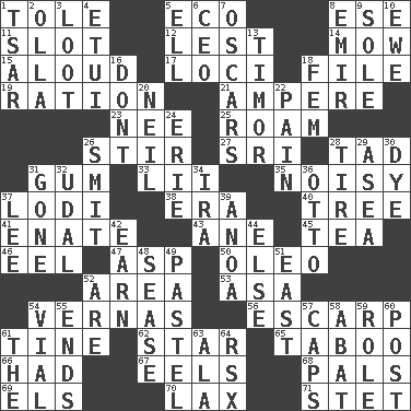 ACROSS 1. Lacquered or enameled metalware 5. Environmental prefix 8. Compass dir. 11. Notch 12. For fear that 14. Cut the grass 15. Verbally 17. Event scenes 18. Do some clerical work 19. Food allowance for one day 21. Electrical Unit 23. Born 25. Wander 26. Agitate 27. _ Lanka 28. Small amount or degree 31. Chewing product 33. Cards in a Roman deck? 35. Annoyingly loud 37. Farming town in central California 38. Period 40. Family _ (genealogy) 41. Related on the mother's side 43. A saturated hydrocarbon 45. Afternoon social gathering 46. Snakelike fish 47. Cleo's killer 50. Butter sub 52. Length times width 53. White ___ sheet 54. Actresses Bloom and Felton 56. Fortification 61. Prong on a fork 62. Play the lead 65. Off limits 66. Possessed 67. Snakelike fish 68. Friends 69. Raised railways 70. Not strict 71. Proofreading order DOWN 1. Russian ruler of old 2. Rounded earthenware pot or jar 3. Spoils 4. Needle case 5. Pipe bend 6. Corporate head (abbr.) 7. Motion picture awards 8. Arab leader 9. Flatfish 10. She-sheep 13. Southeast Indonesia island 16. Do not 18. Opposite of masc. 20. Famous astronaut Armstrong 22. Ache 24. 4th largest of the Great Lakes 26. Stricken, poetically 28. Become fatigued 29. Toward the sea 30. Color 31. Went 32. Freehold land 34. Lyricist Gershwin 36. "Beetle Bailey" pooch 37. Area sheltered from the wind 39. Small Philippine buffalo 42. Merit 44. Otherwise 48. Gospel singer Marvin 49. Soft color 51. Compass direction 52. "We ___ not amused" (Victoria) 54. Small bottle 55. Conclusions 57. Balmoral and tarboosh 58. Blind as ____ 59. Hero or heavy, e.g. 60. Mail 61. Definite Article 63. Insect wing 64. Acura sports coupe