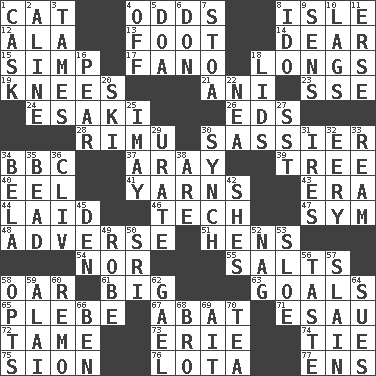 ACROSS 1. Feline 4. Likelihood 8. Small island 12. Chicken ___ king 13. One third of a yard 14. Letter starter 15. Simple or foolish person 17. Papal veil 18. Yearns 19. Leg joints 21. Cuckoo 23. Compass dir. 24. 1973 Nobel Price Winner (Physics) Leo 26. Begley and Asner 28. Tall New Zealand timber tree 30. More disrespectful 34. English channel? 37. Like ___ of sunshine 39. Relationship diagram 40. Snakelike fish 41. Tall tales 43. Epoch 44. Put down 46. Technician 47. Symbol (abbr.) 48. Contrary to your interests or welfare 51. Coop moms 54. Not either 55. Table seasonings 58. Boat paddle 61. Of large size 63. Finish lines 65. Military trainee 67. Blind as ____ 71. He sold his birthright 72. Not wild 73. One of the Great Lakes 74. Make a knot 75. The Jewish people; Israel 76. Globular water bottle used in Asia 77. Followers of ems DOWN 1. Keg 2. Place in a line 3. Domesticates 4. Below a satisfactory level 5. ___ good deed 6. Spanish title 7. Portico 8. Wedding promise 9. Elected reps. 10. Falls behind 11. Celtic language 16. Lightbulb-shaped fruit 18. Flaplike coverings 20. What Jean-Claude Killy likes to do 22. Teachers' org. 25. "If ____ say so..." 27. Fast jet (abbr.) 29. A salt of uric acid 30. Synchronize (abbr.) 31. Angers 32. Suggestive of the supernatural 33. 480, 500 or 516 sheets of paper 34. Actor Lugosi 35. Necklace unit 36. 154 in Roman numerals 38. "We ___ not amused" (Victoria) 42. "______ My Girl" (Turtles hit) 45. Lair 49. Loose flowing garment 50. _ Lanka 52. Tired old horse 53. A type of plum 56. Clothes sense 57. Killed 58. Elects 59. Mountain range southwest of Kyrgyzstan 60. San ____ (Riviera town) 62. Highlander 64. Takes to court 66. Benjamin's nick name 68. Sis' sibling 69. Small island 70. Afternoon social gathering