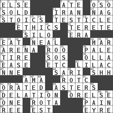 ACROSS 1. Otherwise 5. Had dinner 8. Bear (Spanish) 11. Exchanged or delivered for money 12. SW Asia republic 13. Tired old horse 14. Unemotional ones 17. A testis 19. Principles of right and wrong 21. Cylindrical with tapered ends 22. Grain storage tower 23. Period 24. Ingest 27. Be tempered by heat 29. Make imperfect 32. Sports stadium 34. Friend of Pooh 36. Light colored 37. Hoop that covers a wheel 38. Distress signal 39. Spanish pot 40. Relaxation 41. And so on (abbr.) 42. Pale purple color 43. Compass dir. 44. Indian skirt 46. Quiet! 47. Housemaid (var.) 50. College mil. group 52. Spoke pompously 55. Michaelmas daisies 57. Conveyance 59. Threatening words 62. Single 63. Roll call or roster of names 64. Ache 65. To sift 66. Eastern Standard Time (abbr.) 67. Jane of fiction DOWN 1. Curvy letter 2. Car dealer's back yard 3. _ gin 4. Prepares for publication 5. "We ___ not amused" (Victoria) 6. Clothes sense 7. Keyboard key 8. Single time 9. Table seasoning 10. Double curve, resembling the letter S 12. ___ a Wonderful Life 15. Large country 16. Filth; sediment 18. Retirement account (abbr.) 20. Rough 24. Ingested 25. Believer in; advocate of (suffix) 26. Laconic 28. Plunders 29. Shopping centers 30. Assad's deity 31. Arrive at 33. Born 35. Motion picture awards 36. Luau course 42. 61 cubic inches 45. Printing process, for short 47. _ moment's notice (2 wds.) 48. Distance measurement (Brit.) 49. Goodbye (Sp.) 51. Streamer paper 52. Aroma 53. French philosopher Descartes 54. Toward shelter 55. Santa ___, CA 56. Kill 58. Baseball player Mel 60. Title for a knight 61. Compass dir.