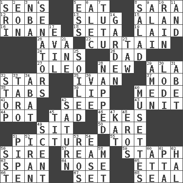 ACROSS 1. Elected reps. 5. Erode 8. "Two Mules for Sister ____" 12. Loose flowing garment 13. Strike heavily 15. Actor Alda or Thicke 16. Empty; void 18. Stalk of a moss capsule 19. Put down 20. Actress Gardner 22. Window treatment 24. Metal containers 26. June honoree 27. Margarine 28. ___ Haven, CT 29. Insect wing 32. Play the lead 35. "Terrible" tsar 37. Crowd into 38. Bar bills 39. Mouth edge 40. Ancient Persian 41. Mouth or opening 42. Ooze 43. A single undivided whole 44. Cooking vessel 45. Bit 46. Makes supply last 49. Be seated 50. Have the gumption 51. Photo 55. Small child 56. Father 57. 480, 500 or 516 sheets of paper 59. Staphylococcus 63. Connect, as a bridge 64. Olfactory organ 65. Singer James 66. Portable shelter 67. Arrange properly for use 68. Lick closed DOWN 1. Indian title of respect (Mr.) 2. A really long time 3. Basketball assoc. 4. Legislators 5. Double-curved letter 6. Actor Baldwin 7. Ballerina skirt 8. Vegetable dish 9. Jai _ 10. Water falling in drops from the sky 11. Also 14. Place where plants grow 17. Morally bad or wrong 21. One (Scot) 23. The 23rd letter of the Hebrew alphabet 25. Dirtied 28. Slept 29. So be it 30. Farming town in central California 31. Collude with 32. Halt 33. Pacific island yam 34. Blind as ____ 36. Compete 40. French bagpipes 42. Titan orbits this 45. Teat (slang) 47. Krazy ___ of comics 48. Greek god of love 49. Odor 51. Corncob 52. SW Asia republic 53. Vintage cars 54. Relaxation 56. Fast jet (abbr.) 58. Was introduced to 60. Had dinner 61. Parent Teacher Assoc. 62. Actor Linden